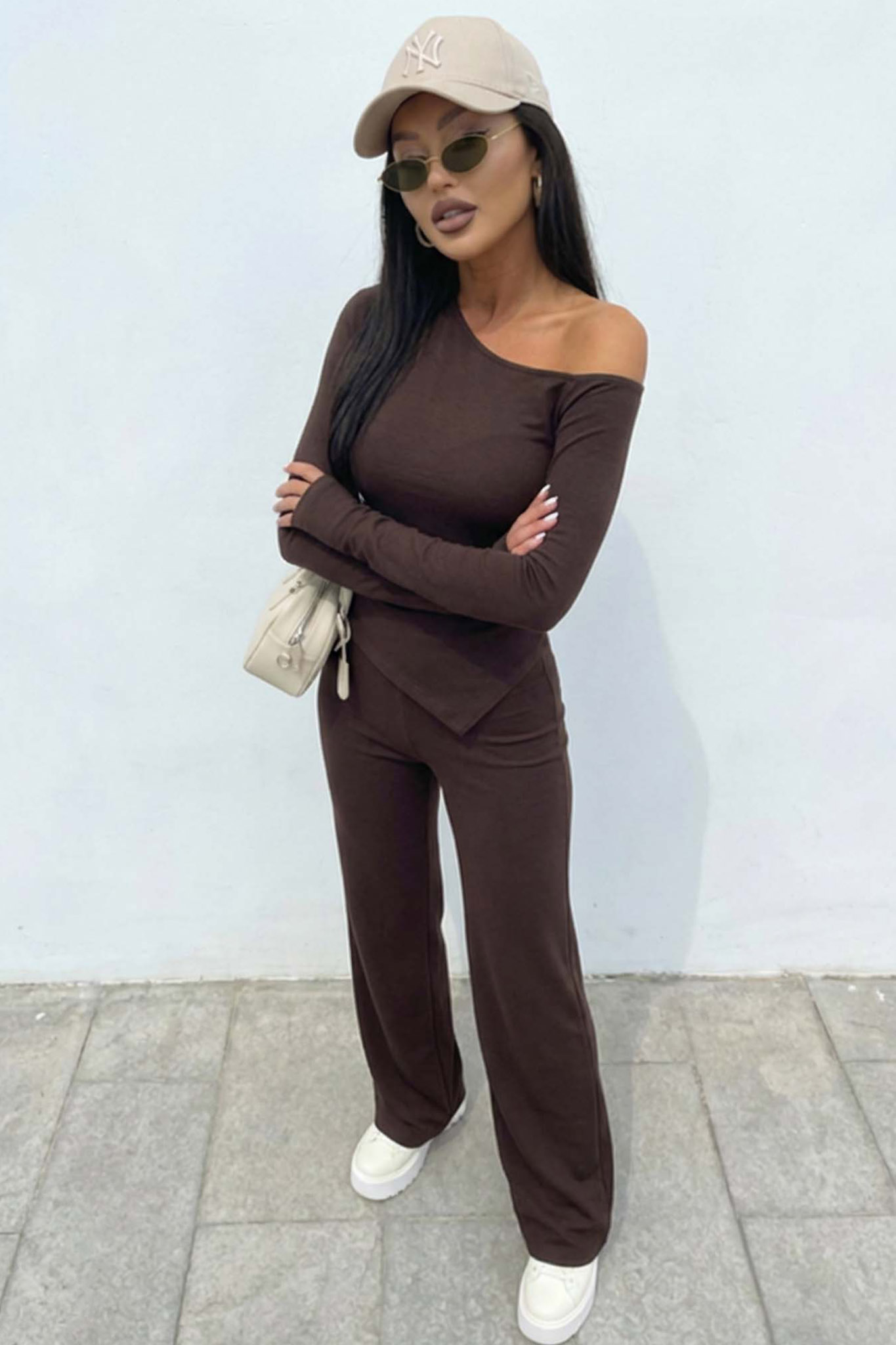 Aaronσετ μπλούζα με ασύμερτο τελείωμα και παντελόνι καφέ