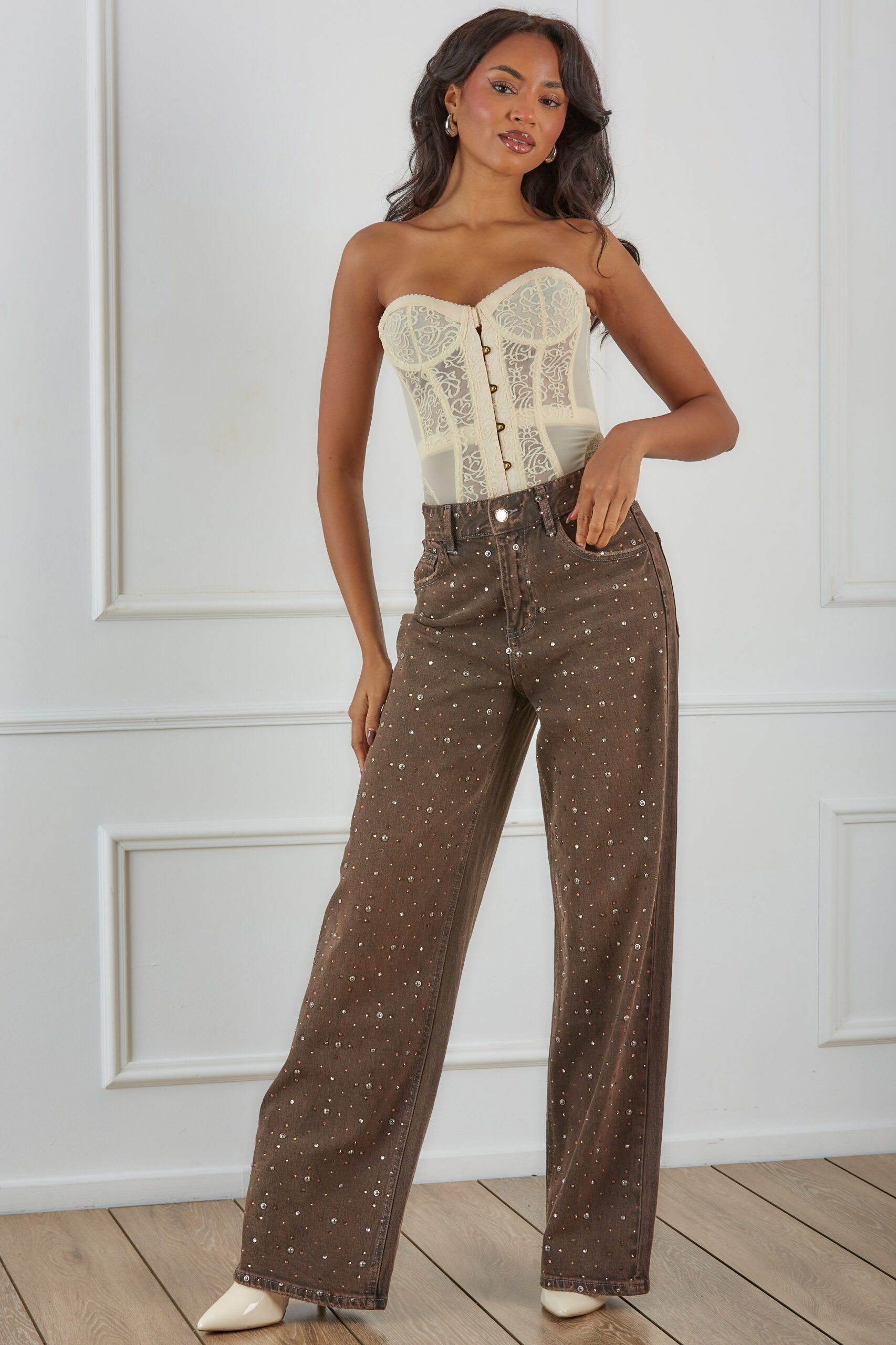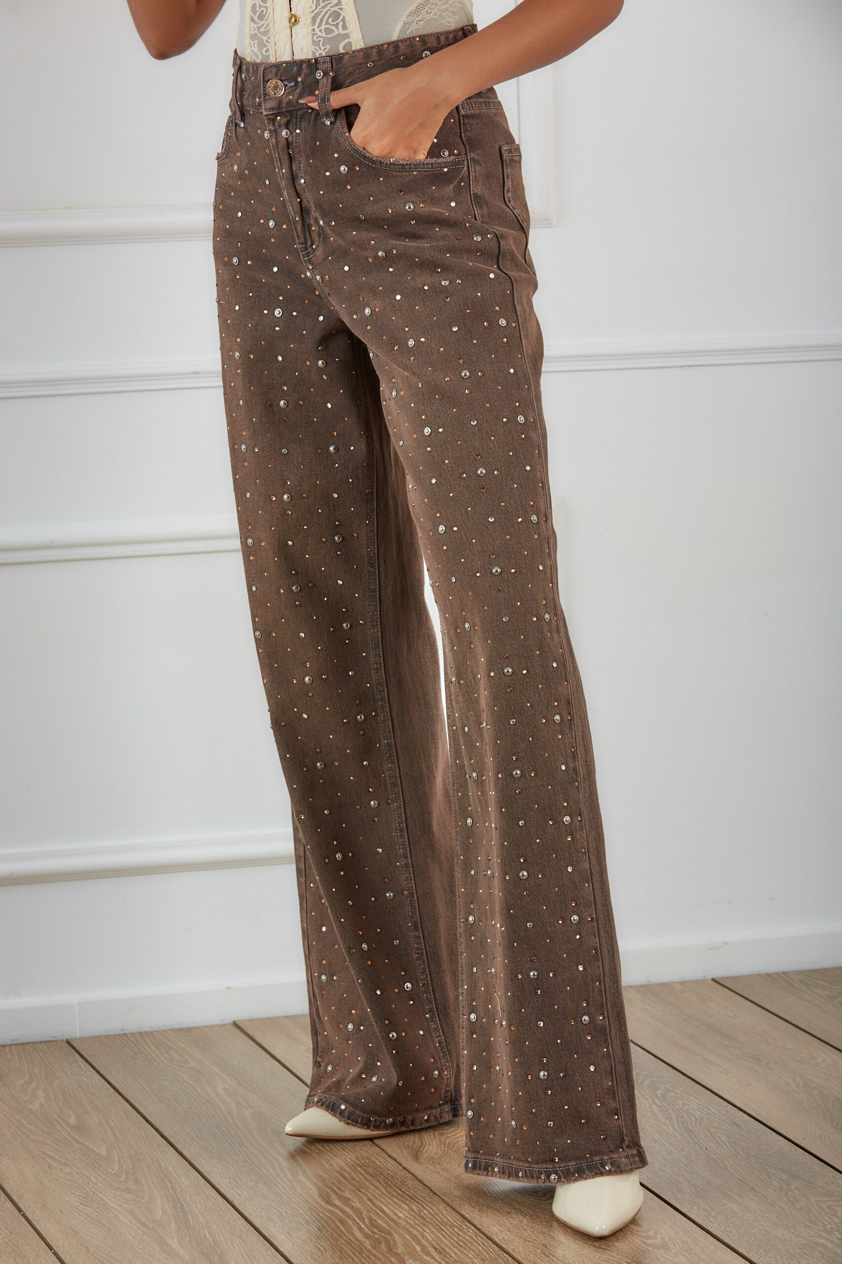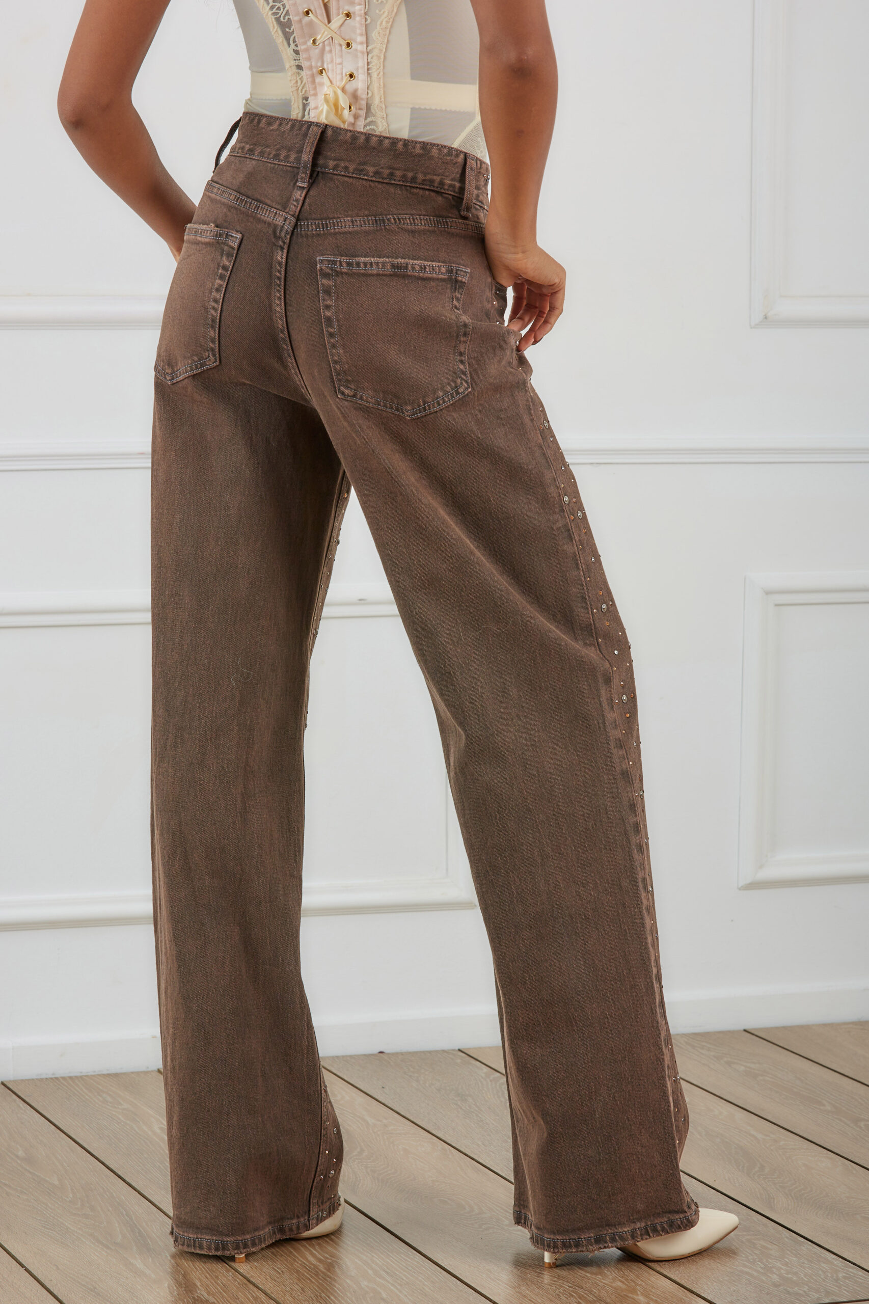 Τζιν παντελόνι σε σκούρο καφέ χρώμα, με στρας στο μπροστινό μέρος και ίσια γραμμή.