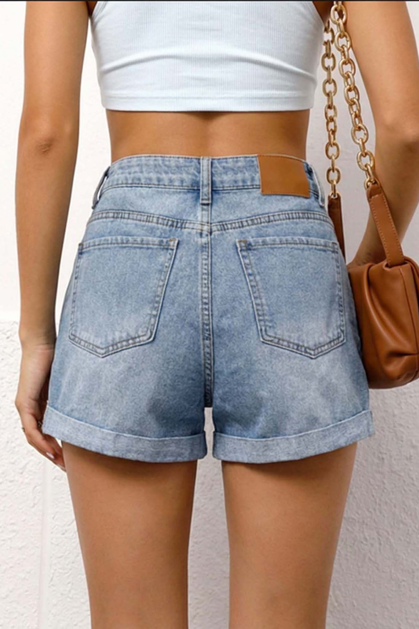 Ψηλόμεσο τζιν σορτς διαθέτει κλασικό σχέδιο με τσέπες και γυρισμένο ρεβέρ στο κάτω μέρος.