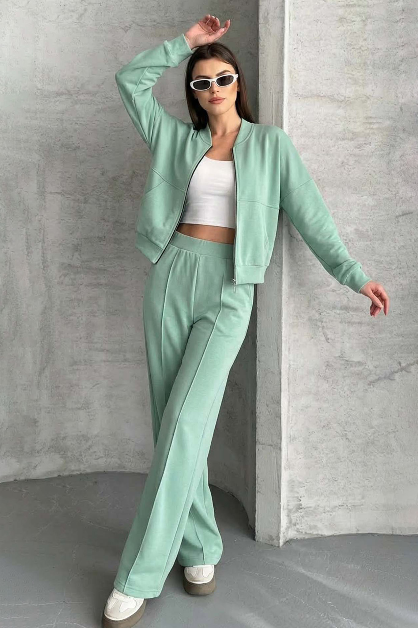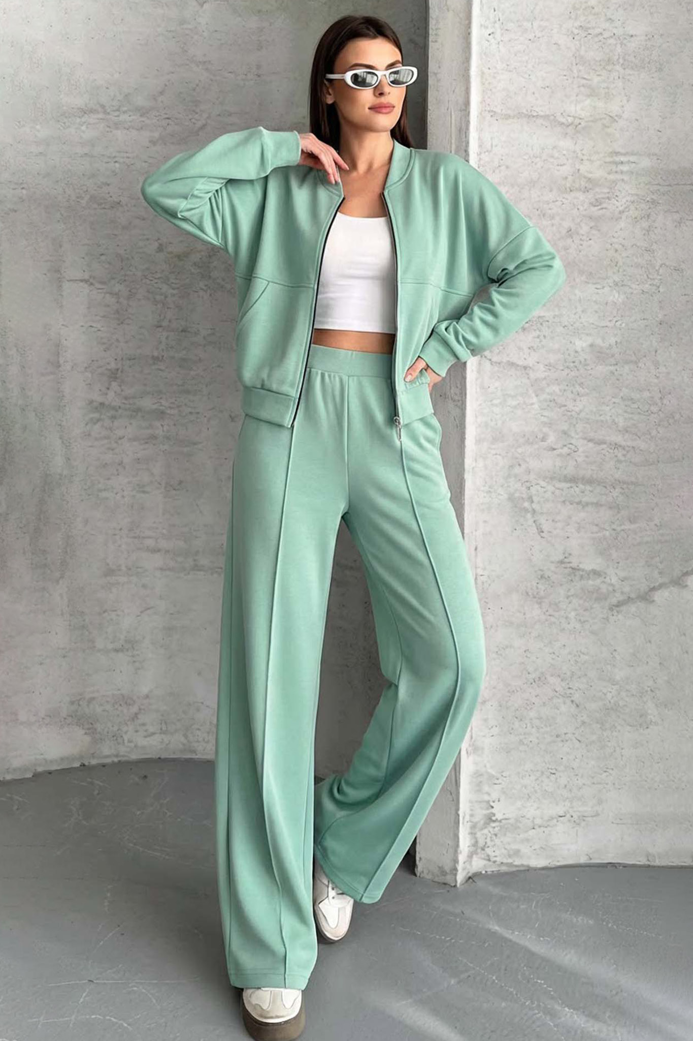Το σύνολο περιλαμβάνει μια ζακέτα τύπου bomber με φερμουάρ και πλαϊνές τσέπες, καθώς και ένα παντελόνι σε ίσια γραμμή με διακοσμητική ραφή (crease detail) που επιμηκύνει τη σιλουέτα.