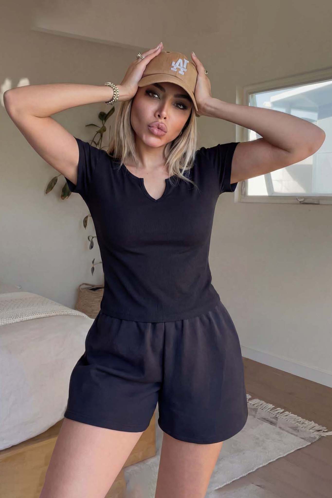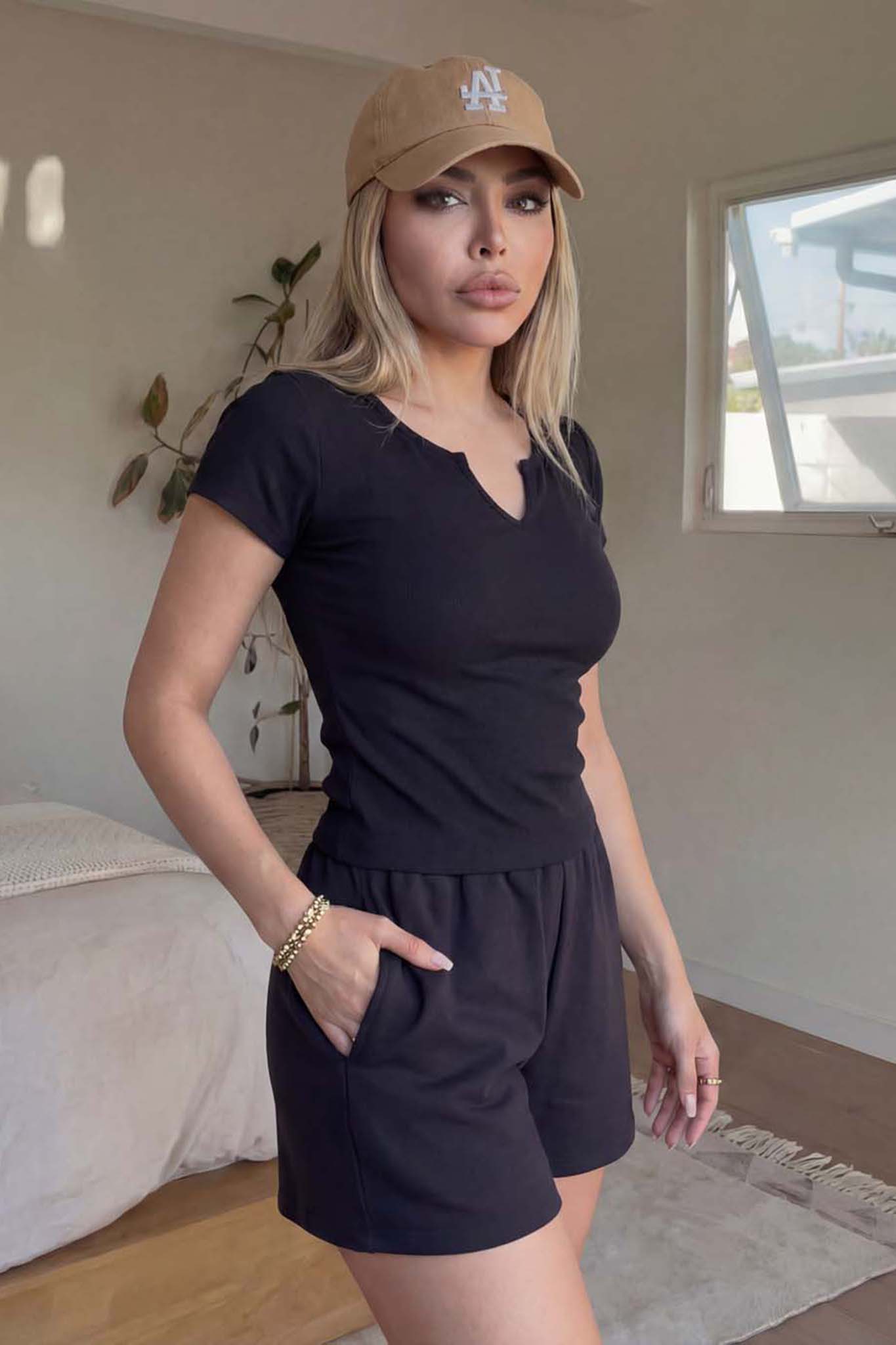 Κοντομάνικη μπλούζα με στενή εφαρμογή και ένα ιδιαίτερο μικρό V άνοιγμα στη λαιμόκοψη.Πρόκειται για ένα μινιμάλ και διαχρονικό κομμάτι που αγκαλιάζει το σώμα, αποτελώντας ένα απαραίτητο στοιχείο για κάθε γκαρνταρόμπα αφού λειτουργεί ως πασπαρτού για αμέτρητους συνδυασμούς.