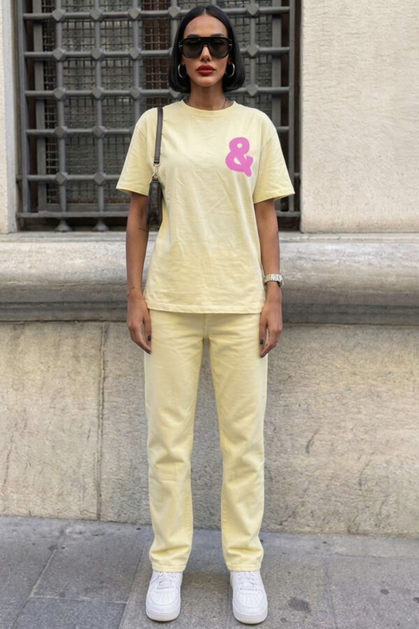 Σετ σακάκι-παντελόνι. Σακάκι με άνετη γραμμή με πέτο, βάτες στους ώμους και φόδρα εσωτερικά. Κλείνει με κουμπί. Παντελόνι ψηλόμεσο με τσέπες και λάστιχο στη μέση στο πίσω μέρος. Κλείνει με φερμουάρ και κουμπί. Σακάκι 71cm μανίκι 61cm στήθος 48cm Παντελόνι Μήκος 110cm μέση 35cm