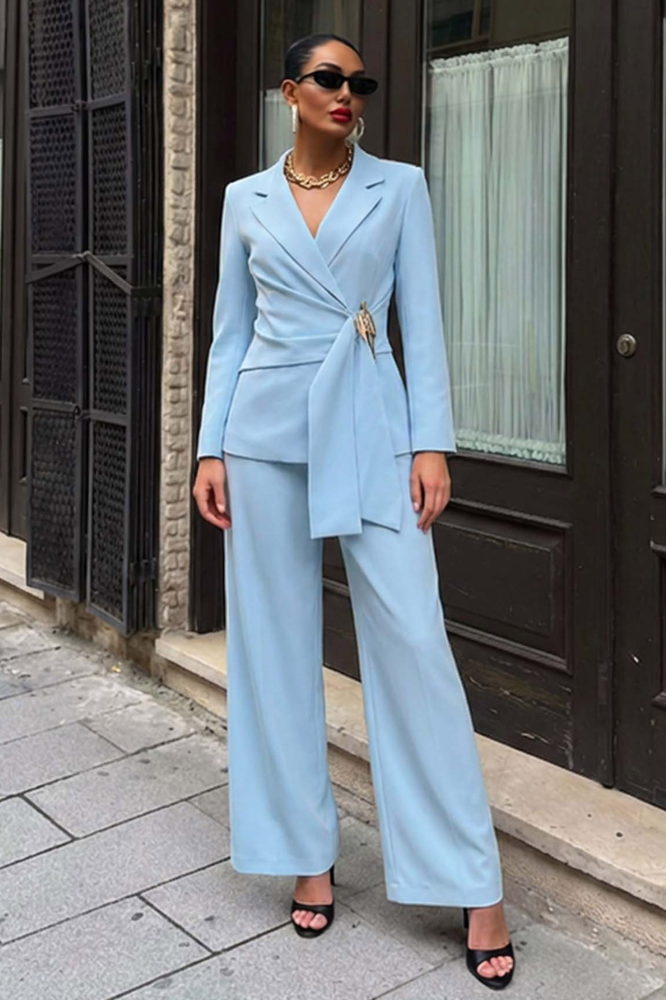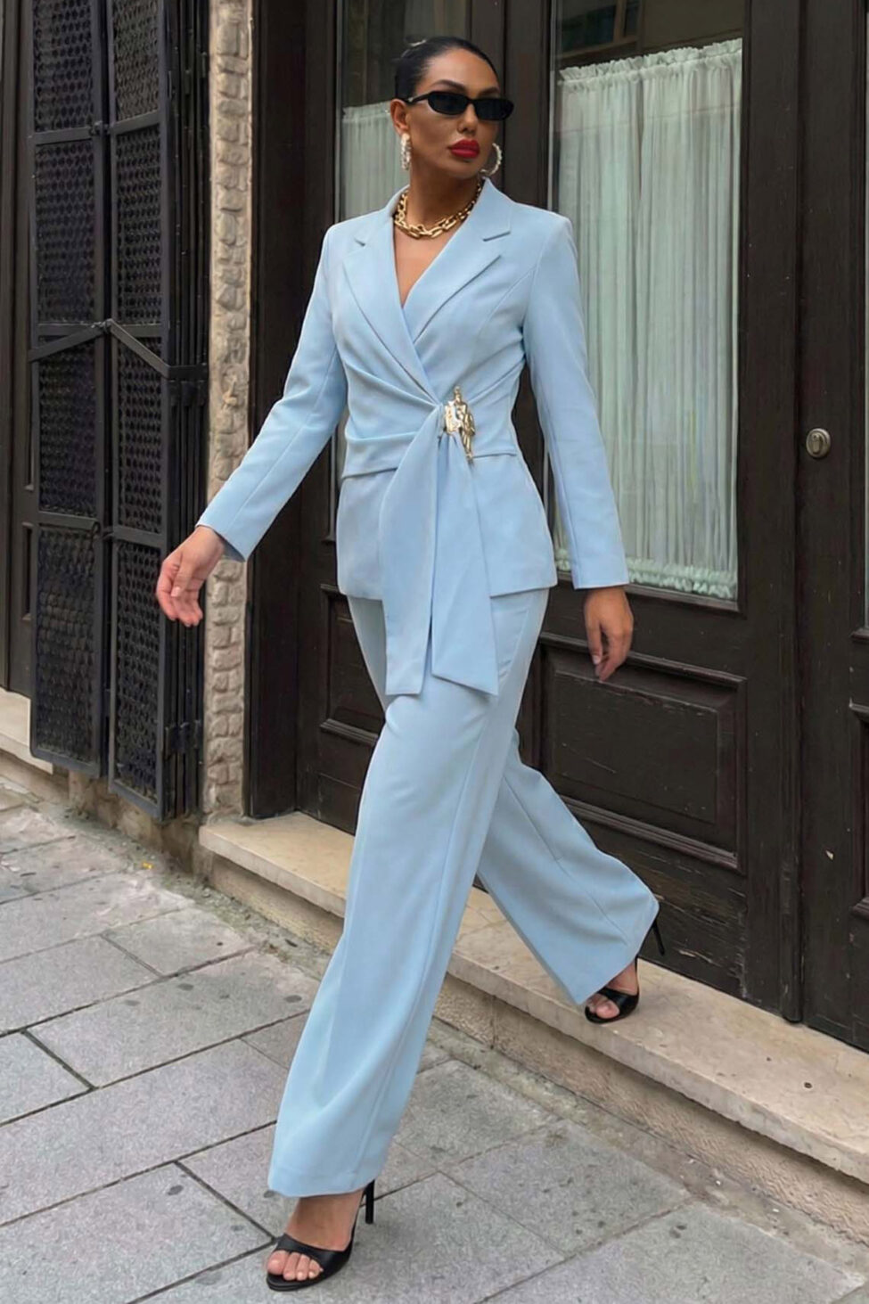 Σετ κοστούμι που αποτελείται από μεσάτο κρουαζέ σακάκι και ψηλόμεση φαρδιά παντελόνα. Το σακάκι ξεχωρίζει για το δέσιμο στο πλάι που αναδεικνύεται από ένα εντυπωσιακό χρυσό κόσμημα-αγκράφα, προσφέροντας μια πολυτελή και δυναμική εμφάνιση.