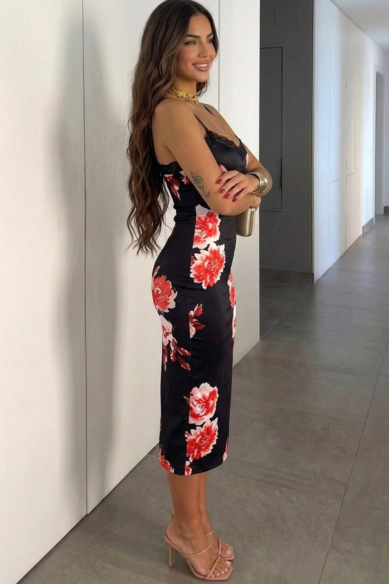 Εφαρμοστό midi φόρεμα με λεπτές τιράντες και έντονο floral μοτίβο. Διαθέτει θηλυκή λεπτομέρεια από δαντέλα στο ντεκολτέ και στενή γραμμή που αναδεικνύει τη σιλουέτα.