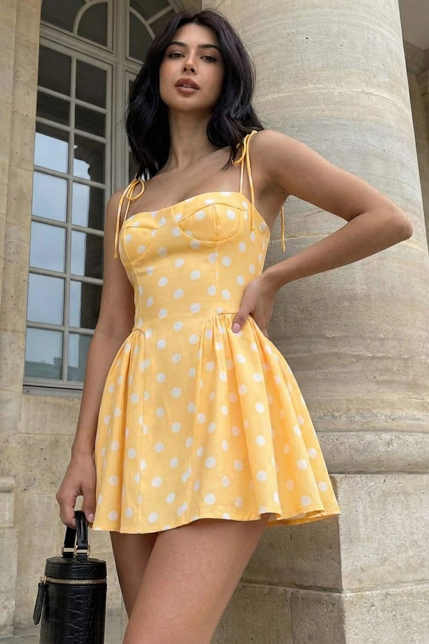 Μίνι φόρεμα με λεπτές τιράντες που δένουν στους ώμους, μπούστο σε στυλ κορσέ, πουά μοτίβο και κλος φούστα με ελαφριές πιέτες.