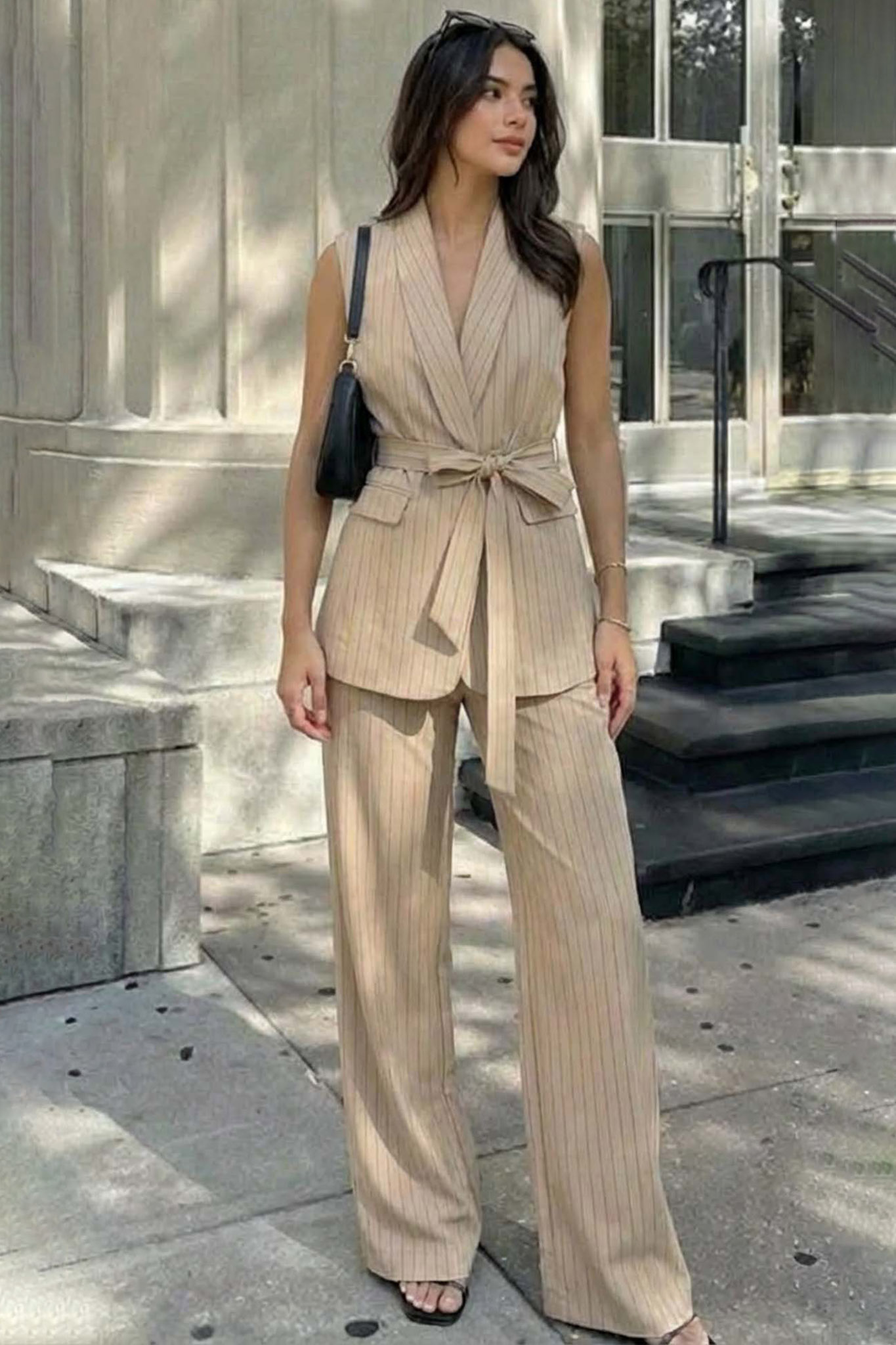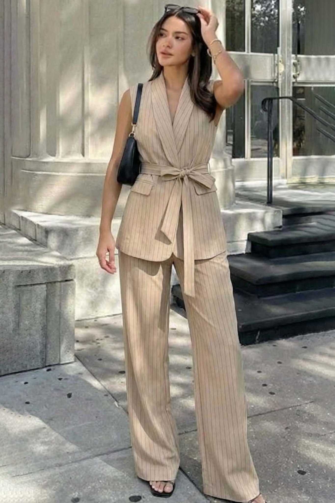 Σετ γιλέκο παντελόνι με διακριτικές ρίγες. Διαθέτει ζωνάκι για να αναδεικνύει τη σιλουέτα.