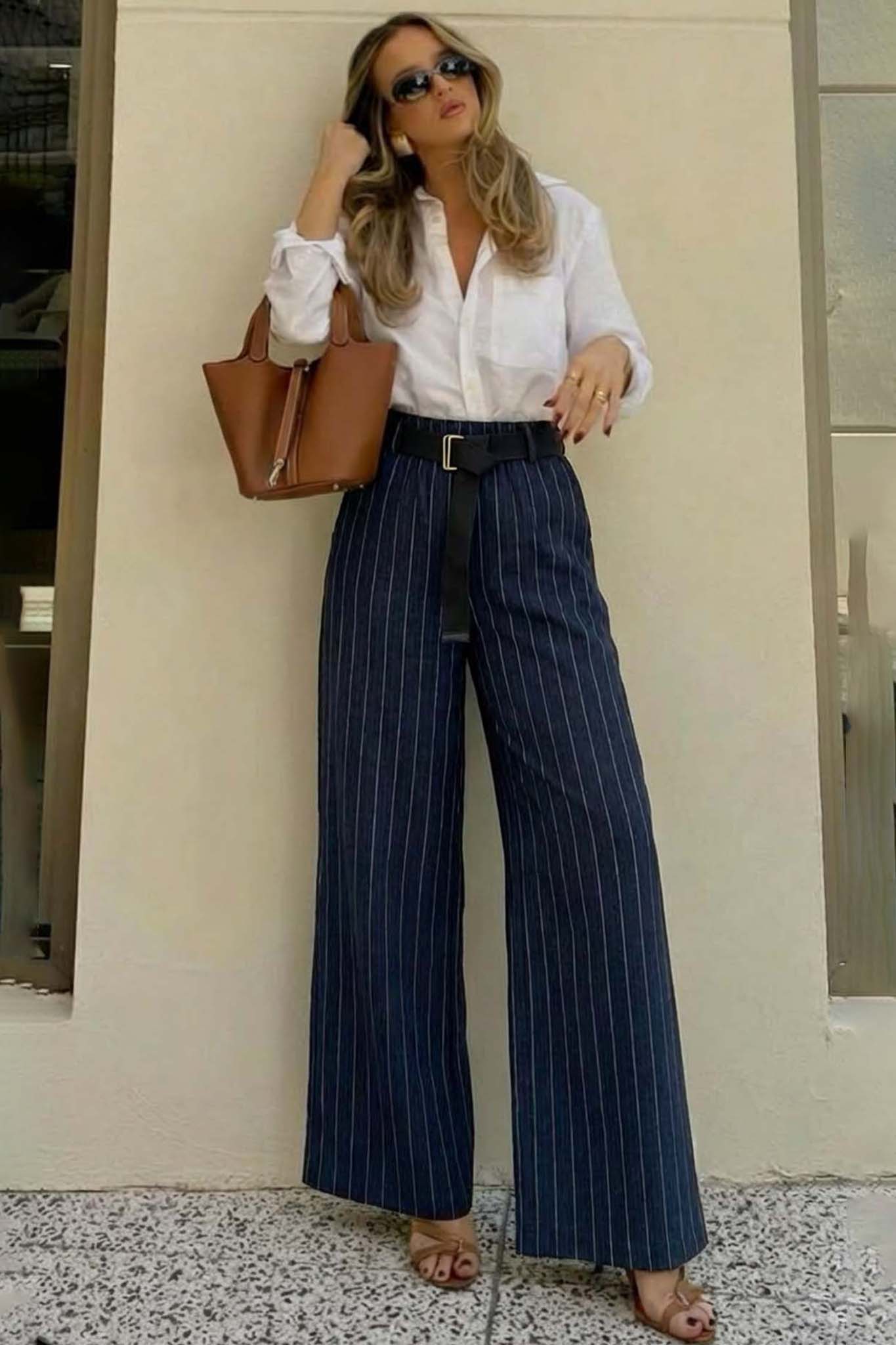Αναδείξτε το στυλ σας με αυτό το κομψό γυναικείο παντελόνι σε ίσια, φαρδιά γραμμή με κάθετες ρίγες που χαρίζουν ύψος και κομψότητα. Διαθέτει ψηλή μέση και μαύρη ζώνη για τέλεια εφαρμογή, ενώ το ελαφρύ και άνετο ύφασμα το καθιστά ιδανικό για όλη τη μέρα, από το γραφείο μέχρι τις βραδινές εξόδους. Συνδυάζεται εύκολα με πουκάμισα ή μπλούζες για ένα ολοκληρωμένο, μοντέρνο look.