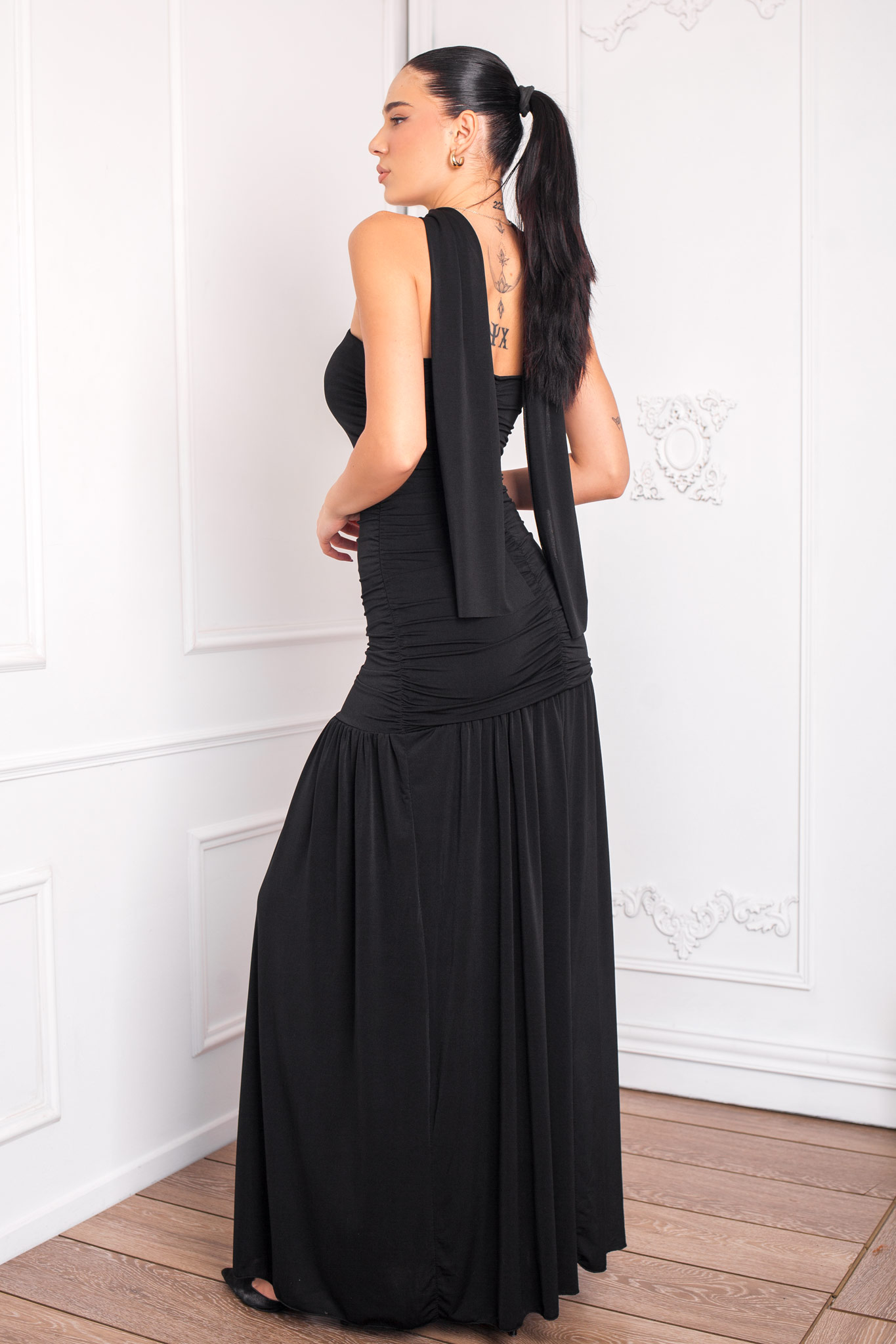 Μίντι φόρεμα με τιράντες και σούρες στην περιφέρεια που αγκαλιάζει το σώμα. Διαθέτει αποσπώμενη κορδέλα στον λαιμό. Μήκος 54cm, στήθος 22cm.