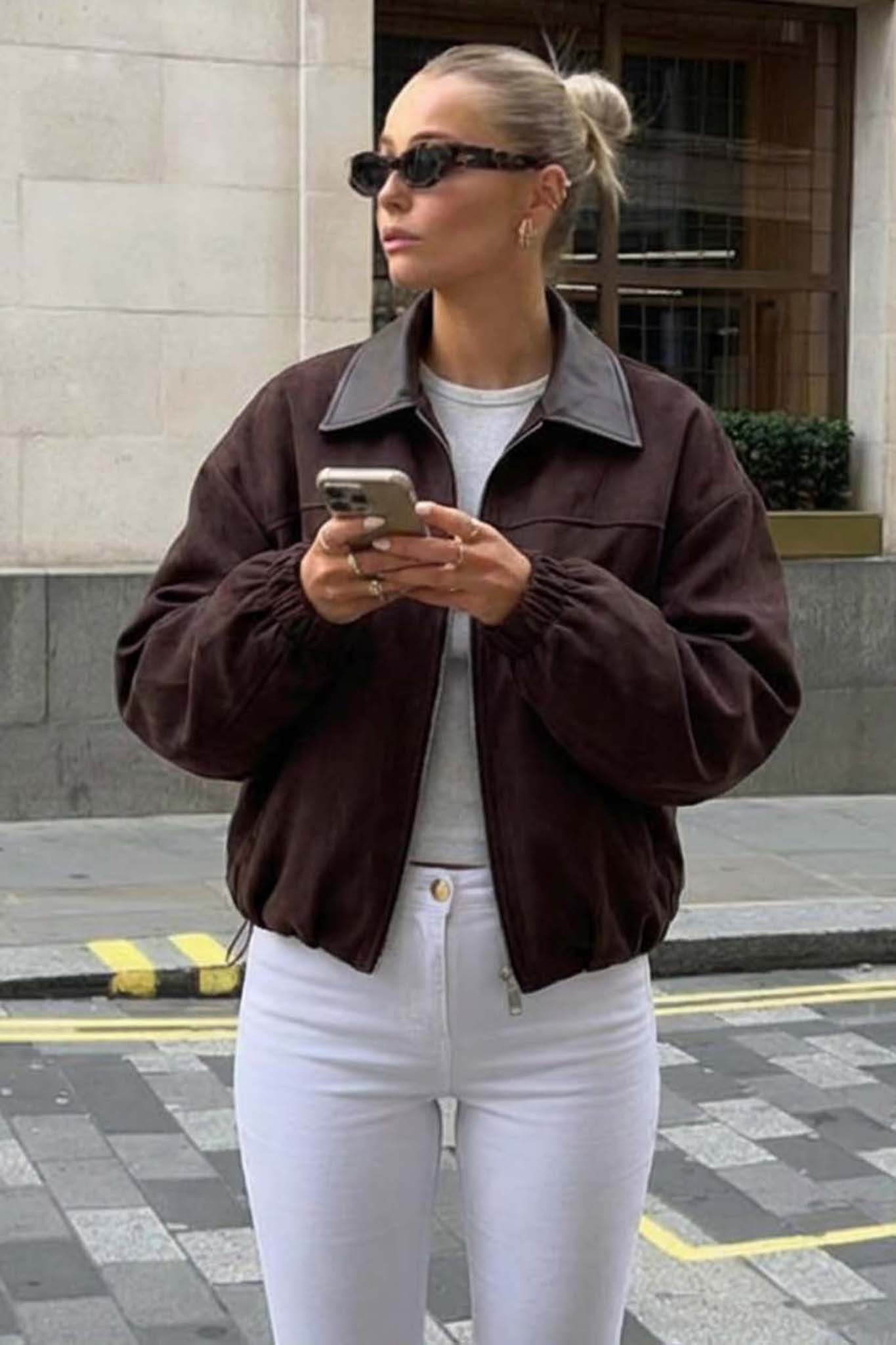 Bomber jacket στυλ μπουφάν. Χαρακτηρίζεται από έναν κλασικό γιακά τύπου πουκαμίσου, κλείσιμο με φερμουάρ μπροστά, πλαϊνές τσέπες και ελαστικό τελείωμα στα μανίκια και το κάτω μέρος, προσφέροντας μια άνετη αλλά κομψή γραμμή.