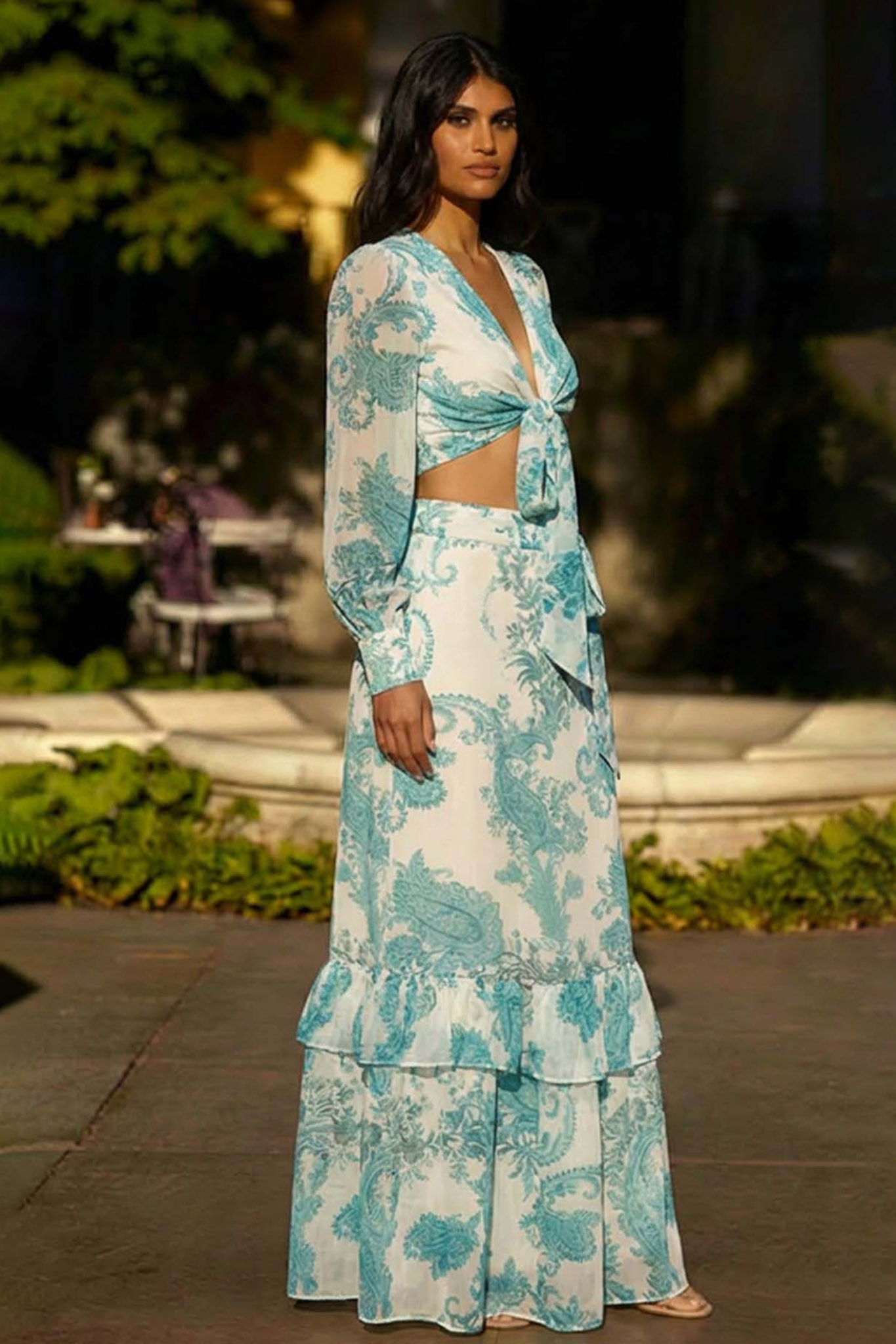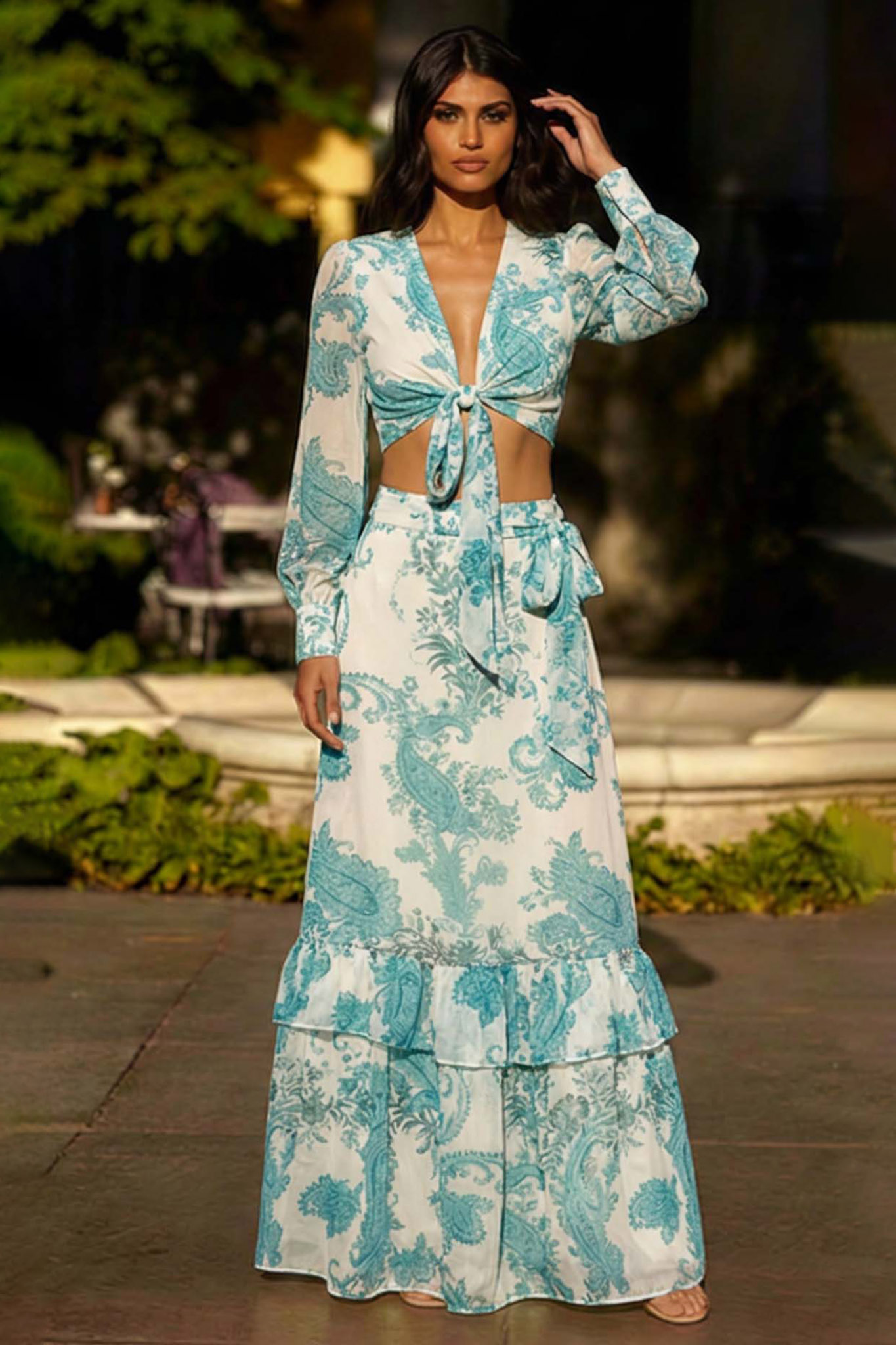 Αυτό το αέρινο σετ αποτελεί μια ιδανική επιλογή για εντυπωσιακές καλοκαιρινές και ανοιξιάτικες εμφανίσεις, συνδυάζοντας τη ρομαντική διάθεση με την boho αισθητική. Το σύνολο αποτελείται από ένα κρουαζέ τοπ που δένει μπροστά και διαθέτει μακριά μανίκια, και μια ασορτί μάξι φούστα με βολάν που χαρίζει κίνηση και θηλυκότητα.