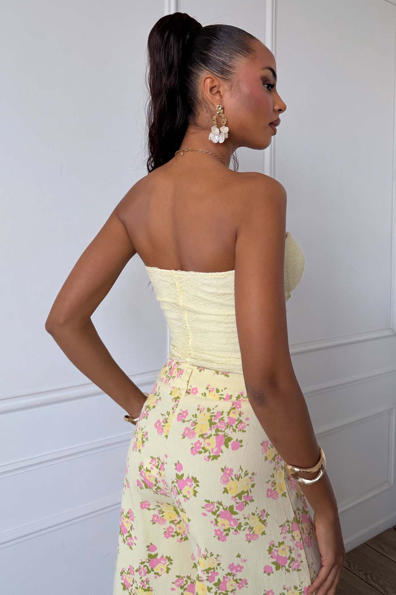 Τοπ σε στυλ κορσέ με θηλυκή, στράπλες γραμμή και ανάγλυφη δαντέλα σε όλη την επιφάνεια. Διαθέτει δομημένα cups σε σχήμα καρδιάς που αναδεικνύουν το μπούστο και κάθετες μπανέλες στο σώμα που προσφέρουν σταθερότητα και σμιλεύουν τη σιλουέτα, καταλήγοντας σε ένα ίσιο τελείωμα στη μέση.