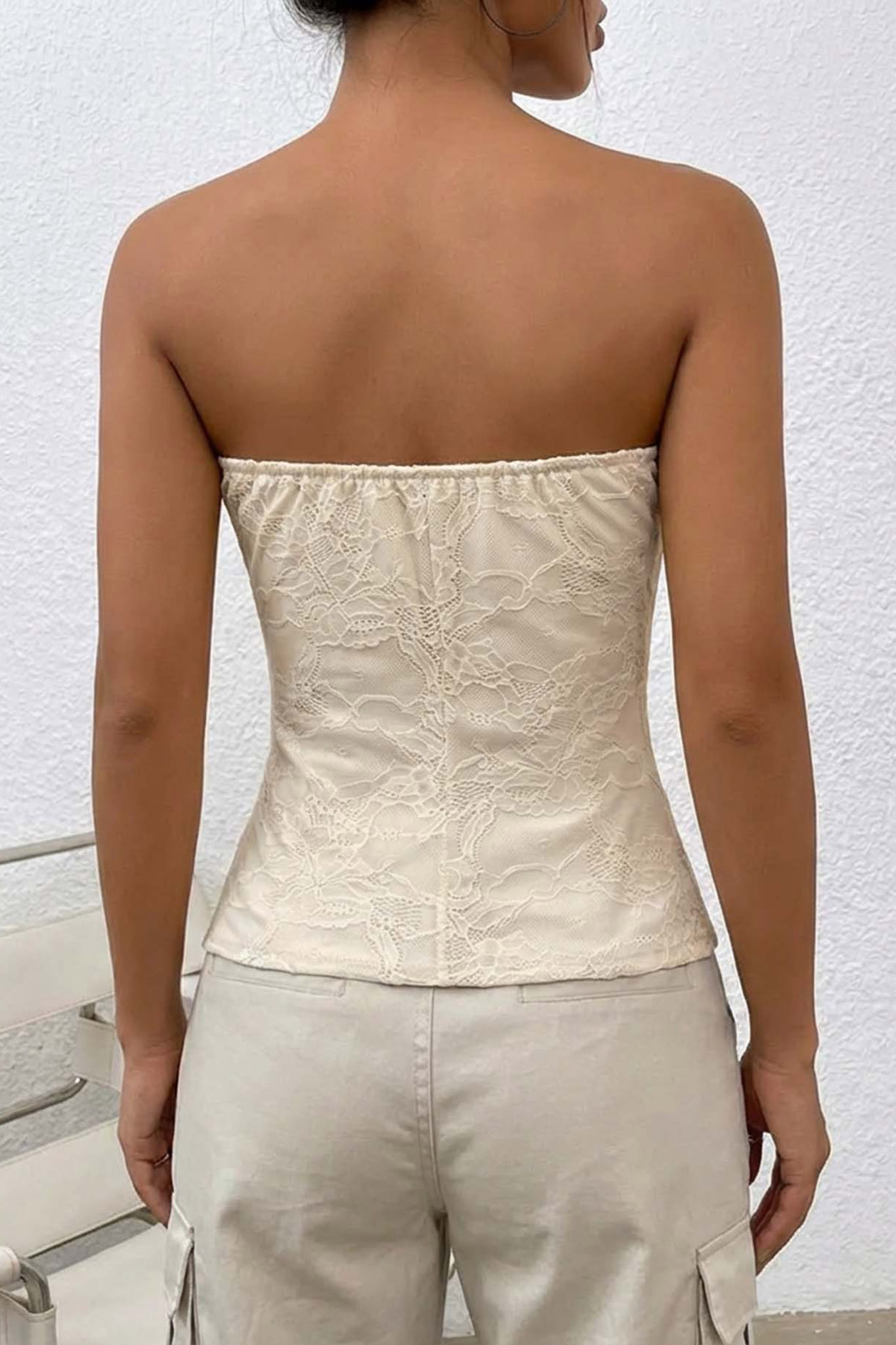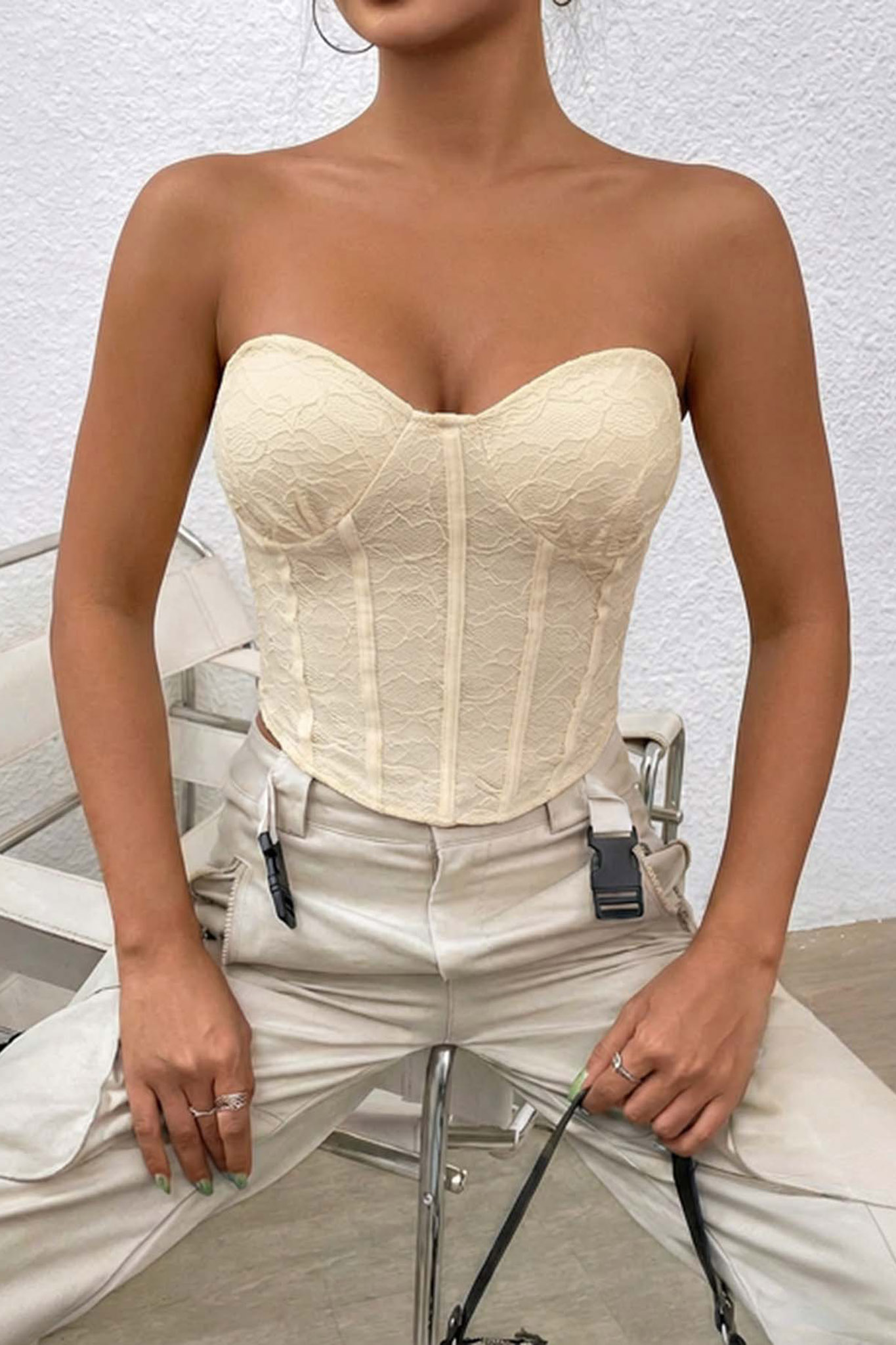 Τοπ σε στυλ κορσέ με θηλυκή, στράπλες γραμμή και ανάγλυφη δαντέλα σε όλη την επιφάνεια. Διαθέτει δομημένα cups σε σχήμα καρδιάς που αναδεικνύουν το μπούστο και κάθετες μπανέλες στο σώμα που προσφέρουν σταθερότητα και σμιλεύουν τη σιλουέτα, καταλήγοντας σε ένα ίσιο τελείωμα στη μέση.