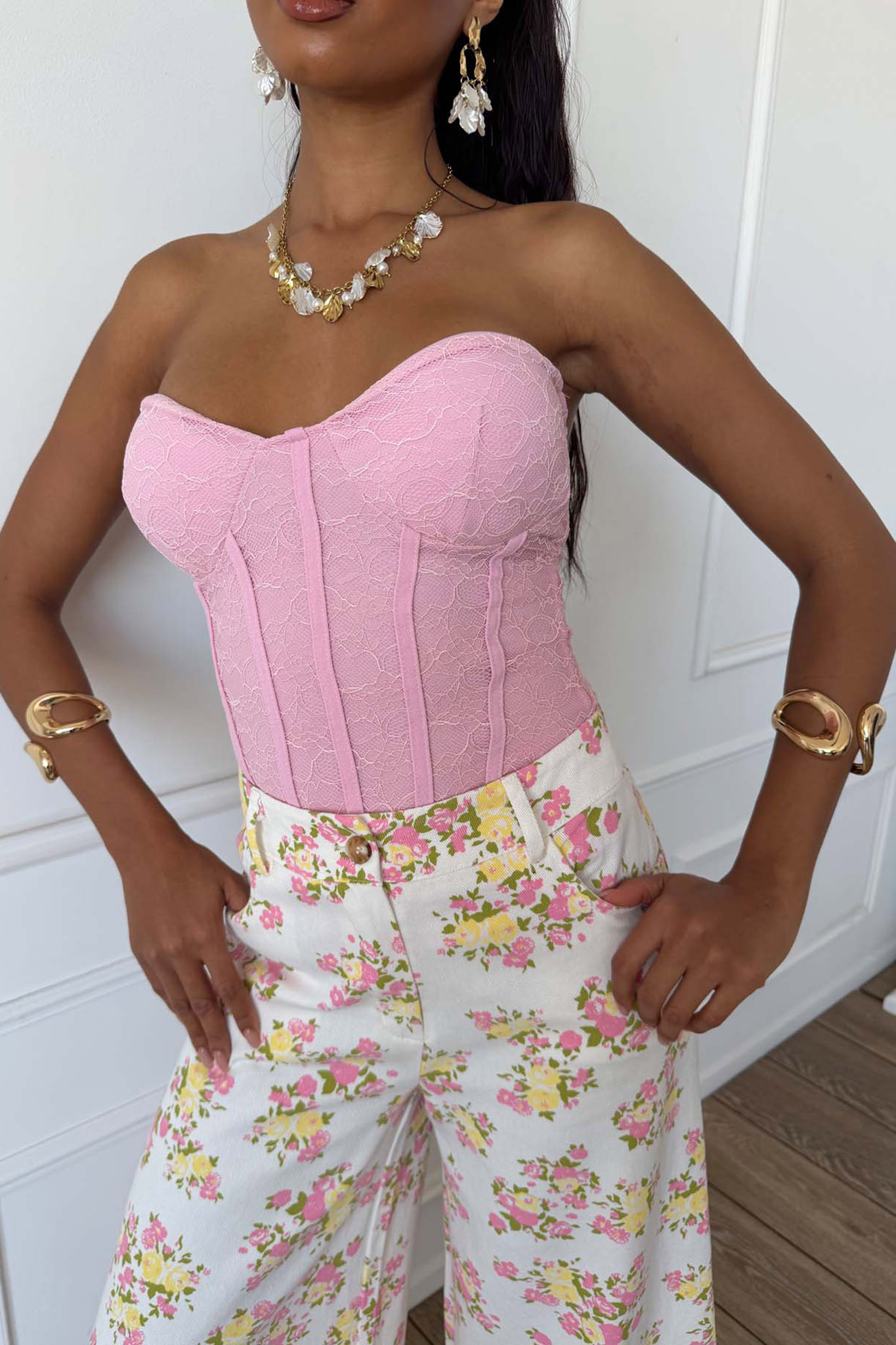 Τοπ σε στυλ κορσέ με θηλυκή, στράπλες γραμμή και ανάγλυφη δαντέλα σε όλη την επιφάνεια. Διαθέτει δομημένα cups σε σχήμα καρδιάς που αναδεικνύουν το μπούστο και κάθετες μπανέλες στο σώμα που προσφέρουν σταθερότητα και σμιλεύουν τη σιλουέτα, καταλήγοντας σε ένα ίσιο τελείωμα στη μέση.