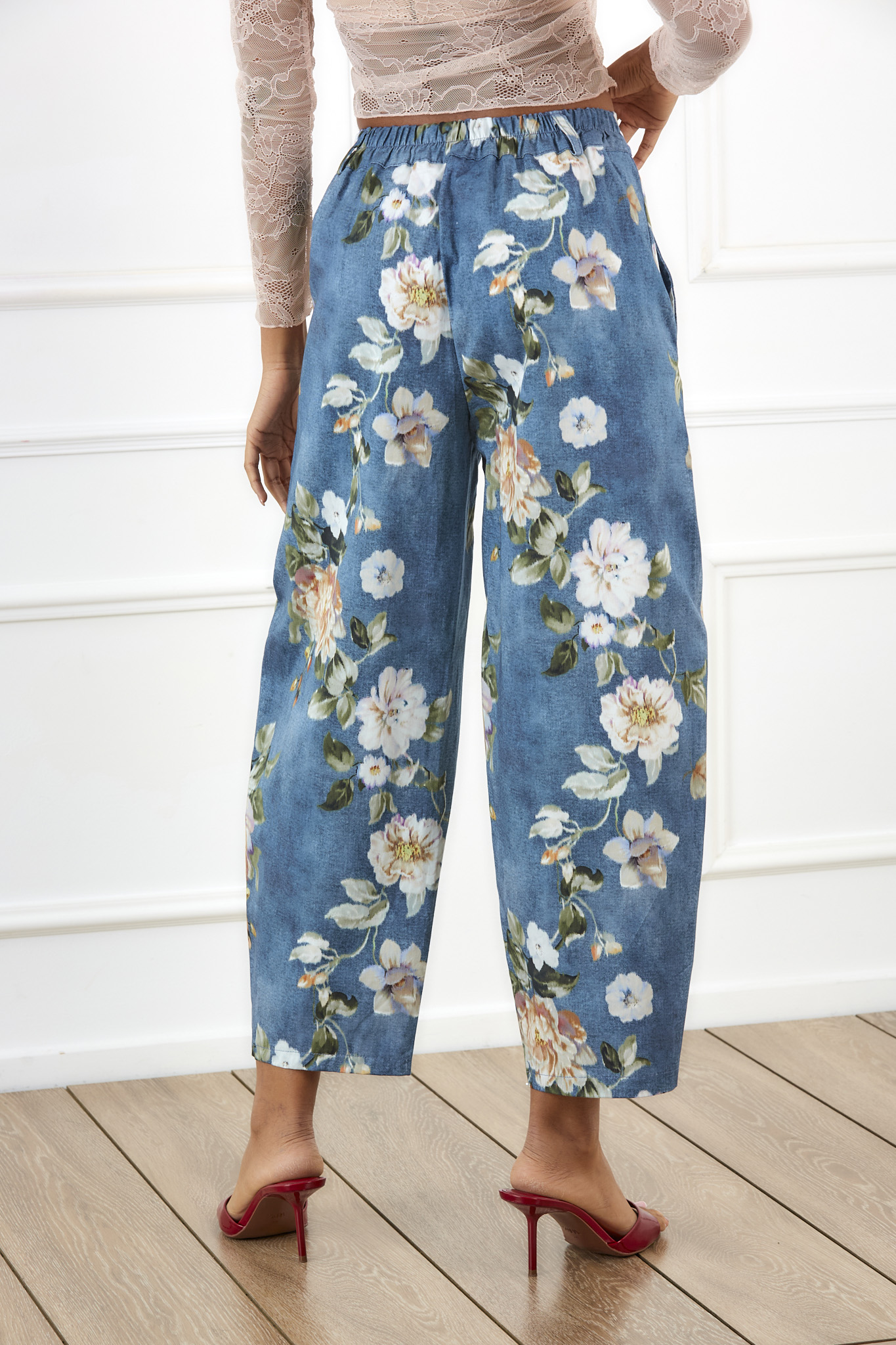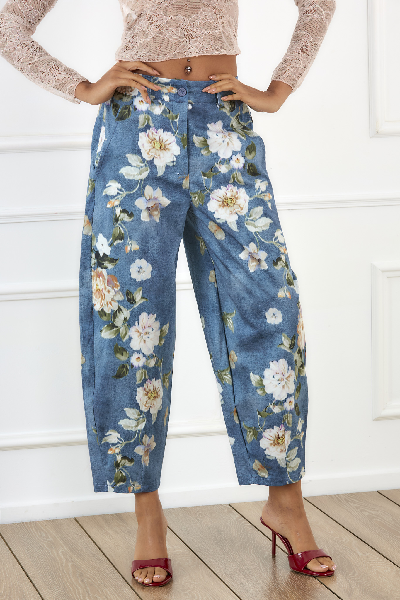 Αναδείξτε το στυλ σας με αυτή την ψηλόμεση παντελόνα σε denim υφή και εντυπωσιακό floral print. Διαθέτει άνετη, φαρδιά γραμμή που κολακεύει κάθε σωματότυπο και κλείσιμο με κουμπί μπροστά. Ιδανική για ρομαντικά και κομψά looks από το πρωί έως το βράδυ.