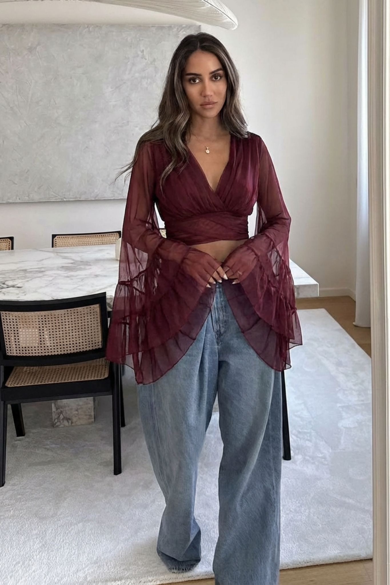 Αναδείξτε το boho-chic πνεύμα σας με αυτό το εντυπωσιακό, κοντό τοπ σε ζεστή, καφέ απόχρωση, ιδανικό για ξεχωριστές εμφανίσεις. Κατασκευασμένο από ημιδιάφανο ύφασμα mesh, διαθέτει βαθιά V λαιμόκοψη και εντυπωσιακά μακριά μανίκια-καμπάνες με βολάν, προσθέτοντας κίνηση και δραματικό στυλ στην εμφάνισή σας. Φορέστε το με ψηλόμεσο παντελόνι ή φούστα για ένα ακαταμάχητο, μοντέρνο σύνολο.