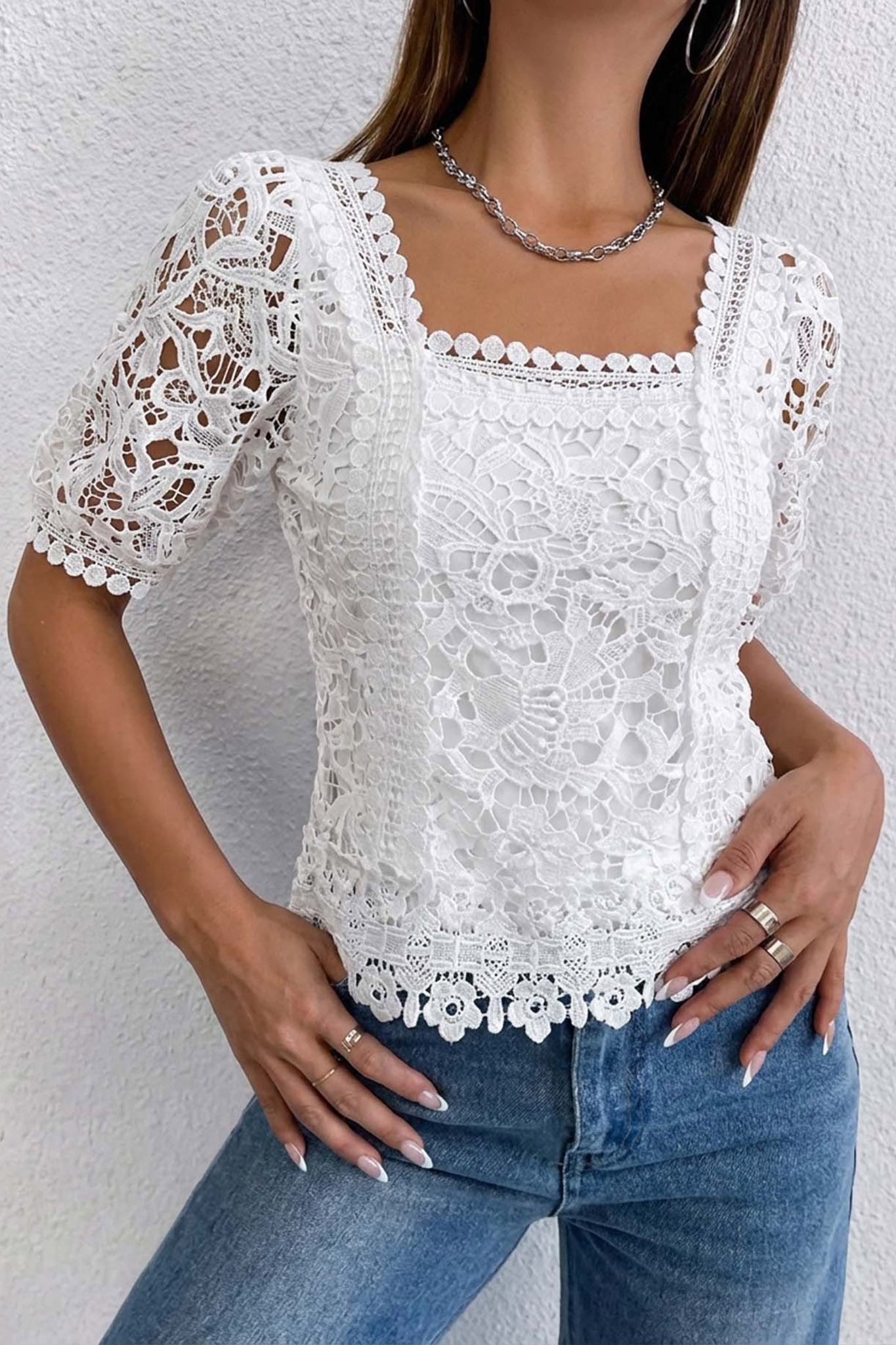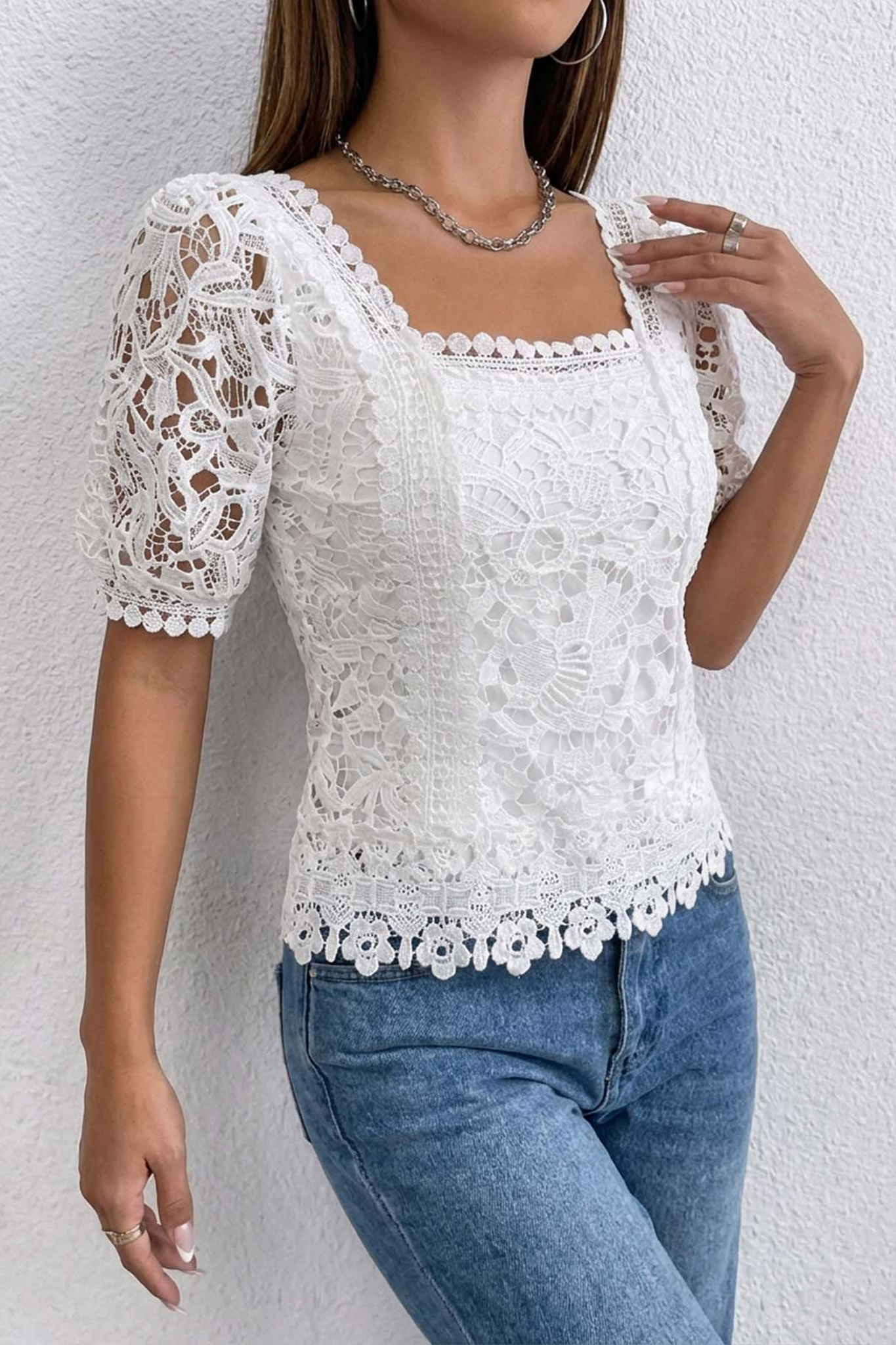 Κοντομάνικη μπλούζα με δαντέλα και τετράγωνη λαιμόκοψη. Ιδανική για να φορεθεί από το πρωί μέχρι το βράδυ.