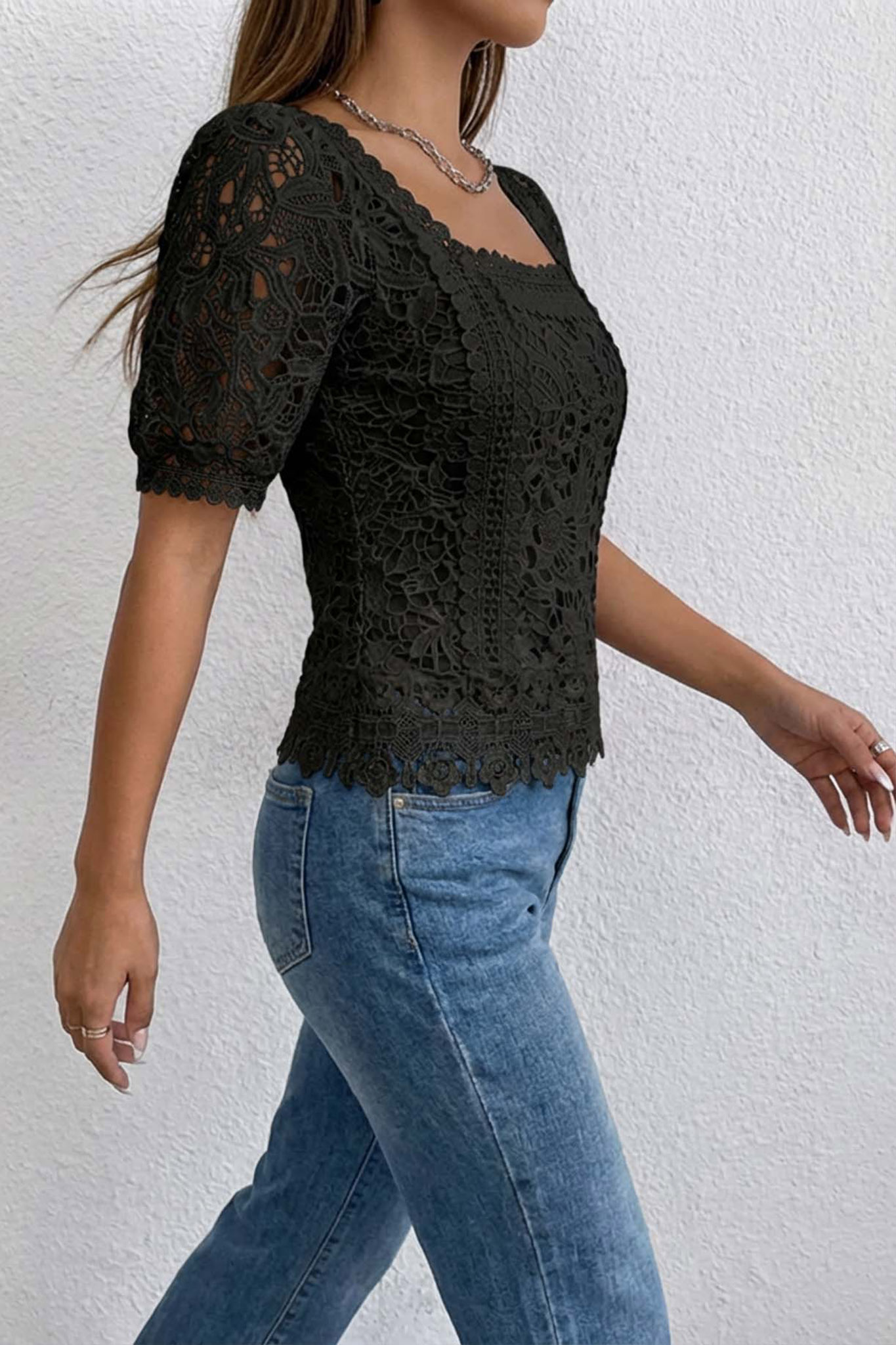 Κοντομάνικη μπλούζα με δαντέλα και τετράγωνη λαιμόκοψη. Ιδανική για να φορεθεί από το πρωί μέχρι το βράδυ.