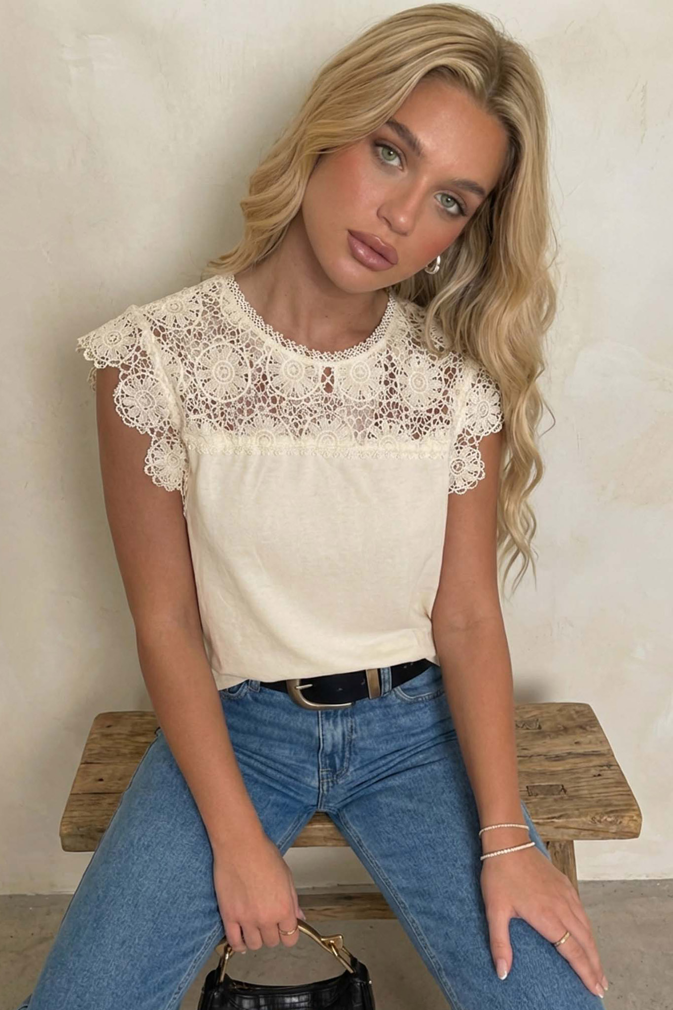 Κοντομάνικη μπλούζα με δαντέλα στο πάνω μέρος που προσδίδει έναν ρομαντισμό.