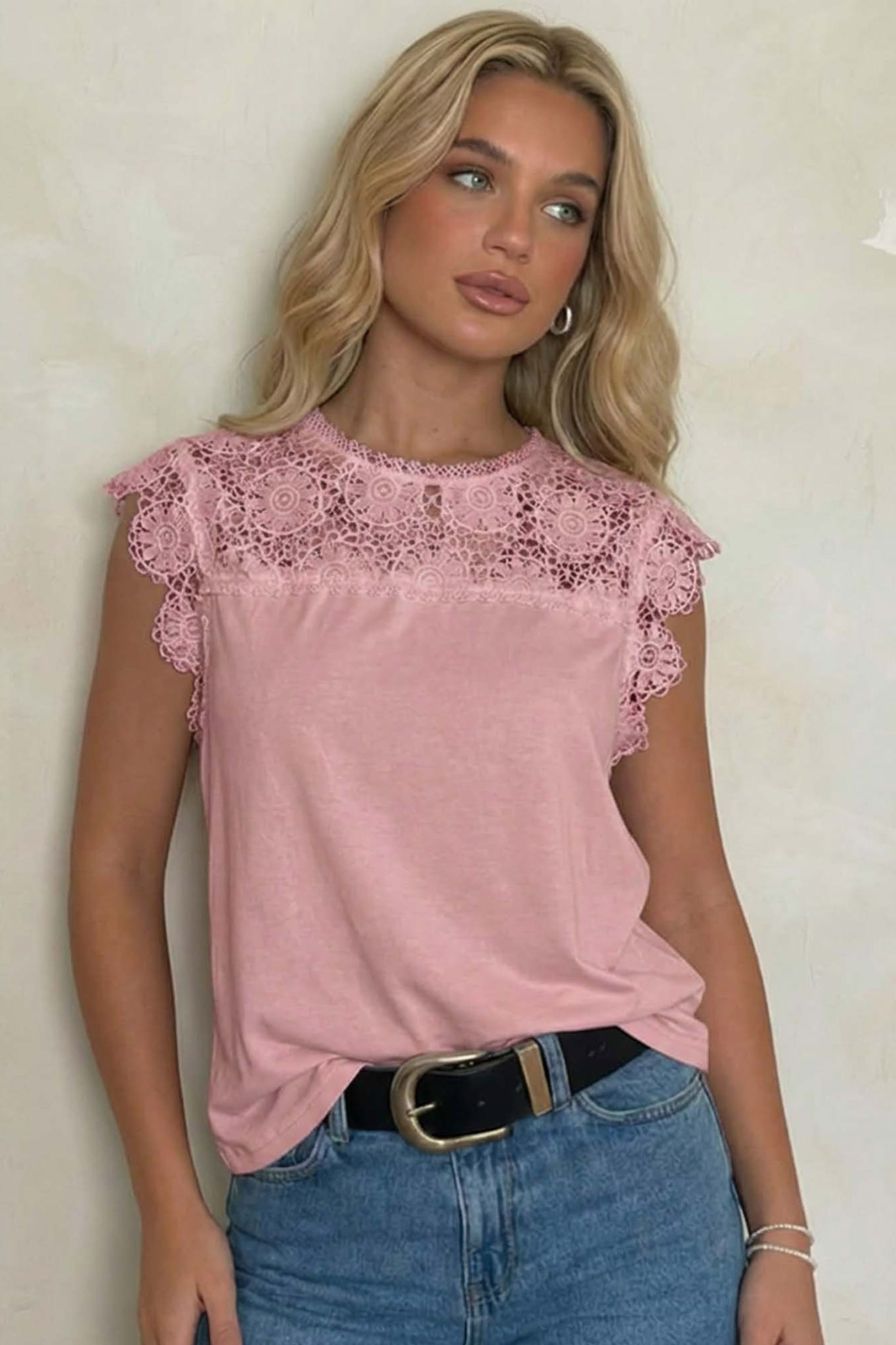 Κοντομάνικη μπλούζα με δαντέλα στο πάνω μέρος που προσδίδει έναν ρομαντισμό.