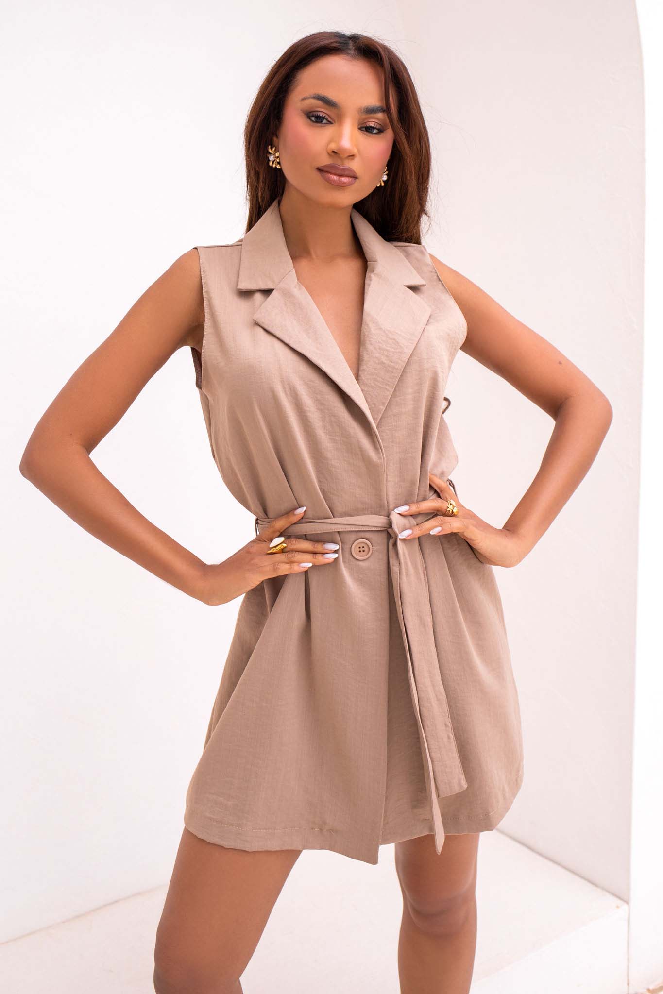 Αμάνικο blazer φόρεμα σε μίνι μήκος, το οποίο διαθέτει γιακά με πέτο, κλείσιμο με κουμπιά και υφασμάτινη ζώνη στη μέση. Είναι ένα ευέλικτο κομμάτι που μπορεί να φορεθεί είτε μόνο του ως φόρεμα είτε ανοιχτό ως γιλέκο.