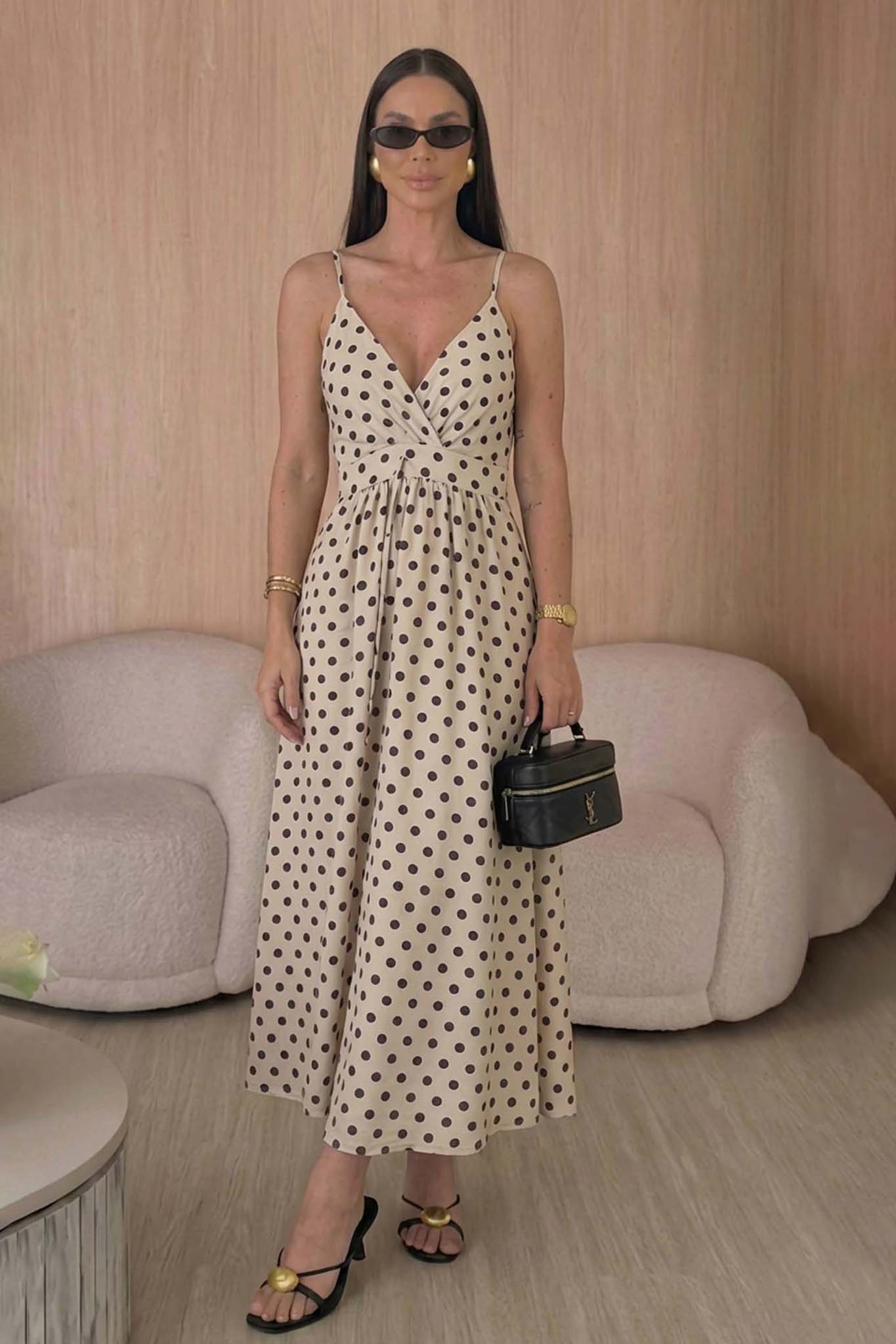 Μίντι φόρεμα με λεπτές τιράντες και κρουαζέ μπούστο που σχηματίζει V ντεκολτέ. Διαθέτει πουά σχέδιο σε όλη του την επιφάνεια, ενώ η γραμμή του είναι εφαρμοστή στη μέση και ανοίγει ελαφρώς προς τα κάτω, δημιουργώντας μια αέρινη σιλουέτα.