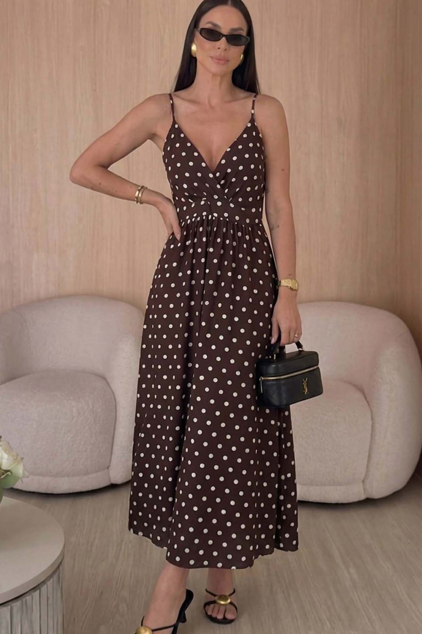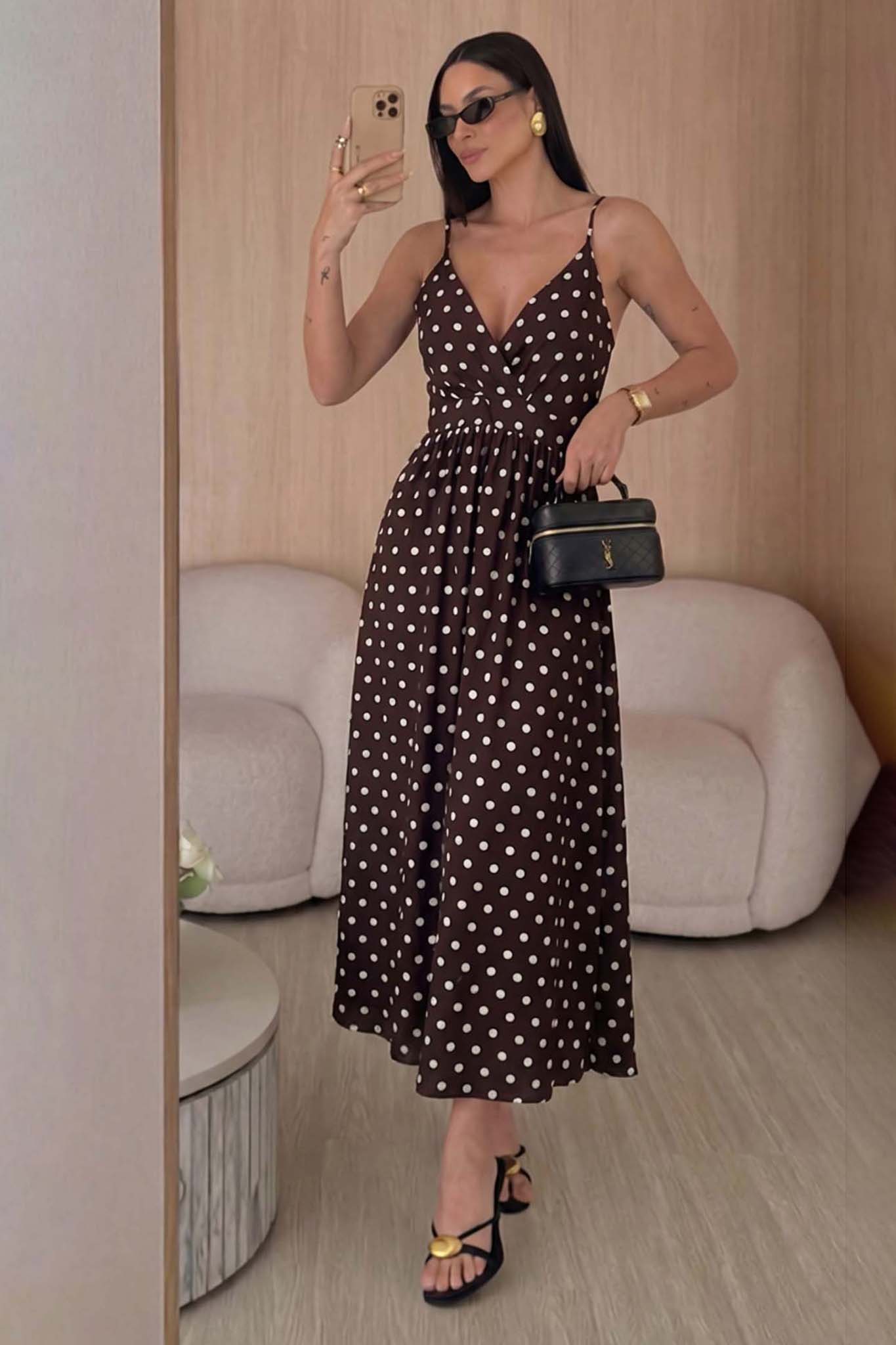 Aristaμίντι πουά φόρεμα με λεπτές τιράντες καφέ