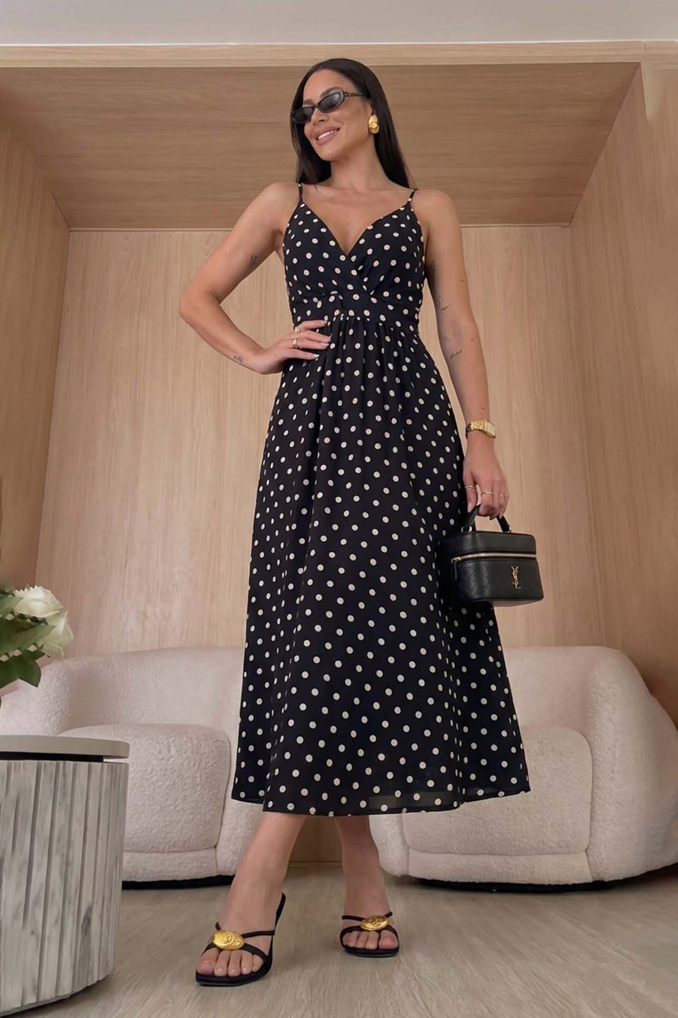 Μίντι φόρεμα με λεπτές τιράντες και κρουαζέ μπούστο που σχηματίζει V ντεκολτέ. Διαθέτει πουά σχέδιο σε όλη του την επιφάνεια, ενώ η γραμμή του είναι εφαρμοστή στη μέση και ανοίγει ελαφρώς προς τα κάτω, δημιουργώντας μια αέρινη σιλουέτα.