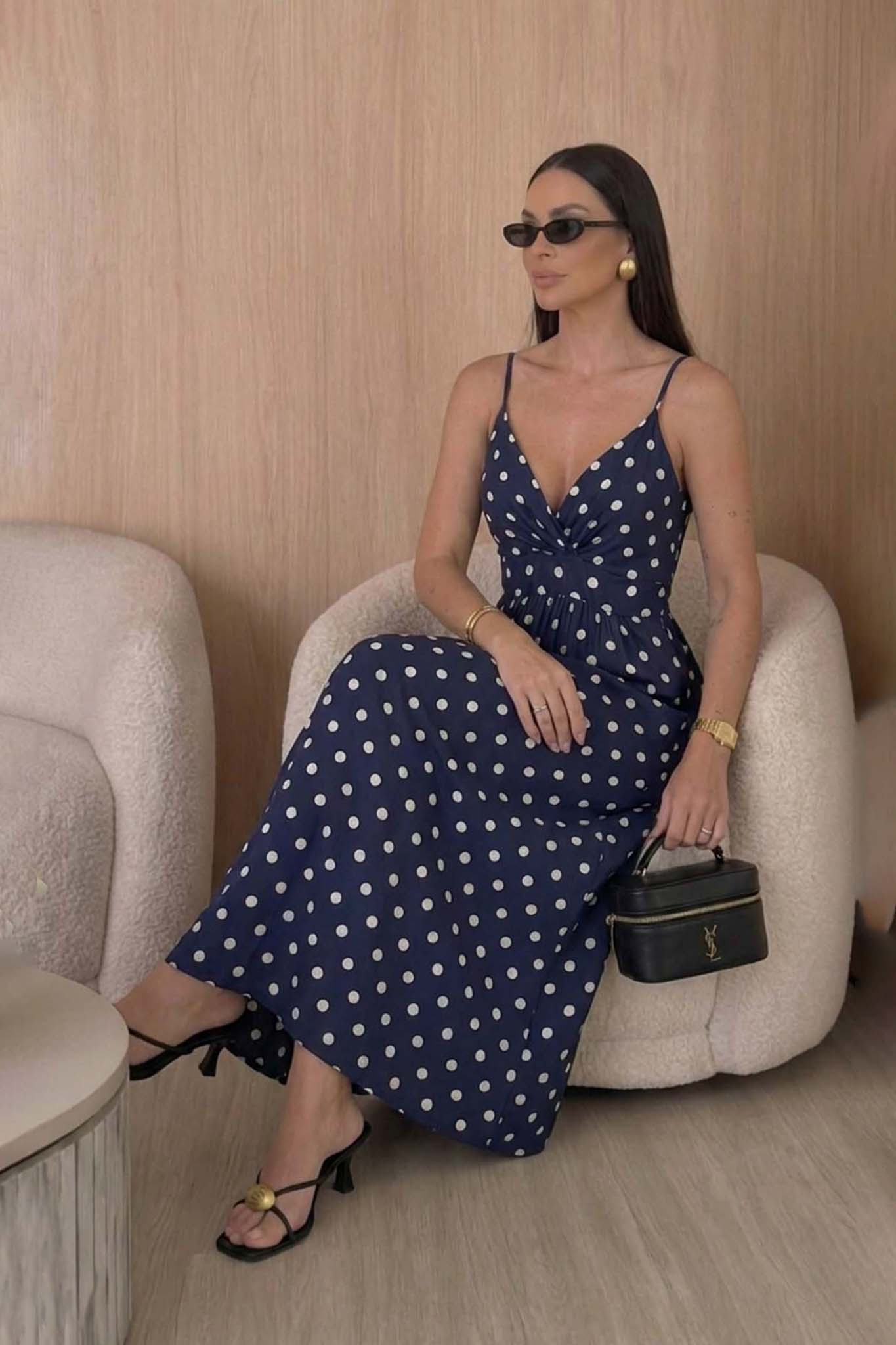 Μίντι φόρεμα με λεπτές τιράντες και κρουαζέ μπούστο που σχηματίζει V ντεκολτέ. Διαθέτει πουά σχέδιο σε όλη του την επιφάνεια, ενώ η γραμμή του είναι εφαρμοστή στη μέση και ανοίγει ελαφρώς προς τα κάτω, δημιουργώντας μια αέρινη σιλουέτα.