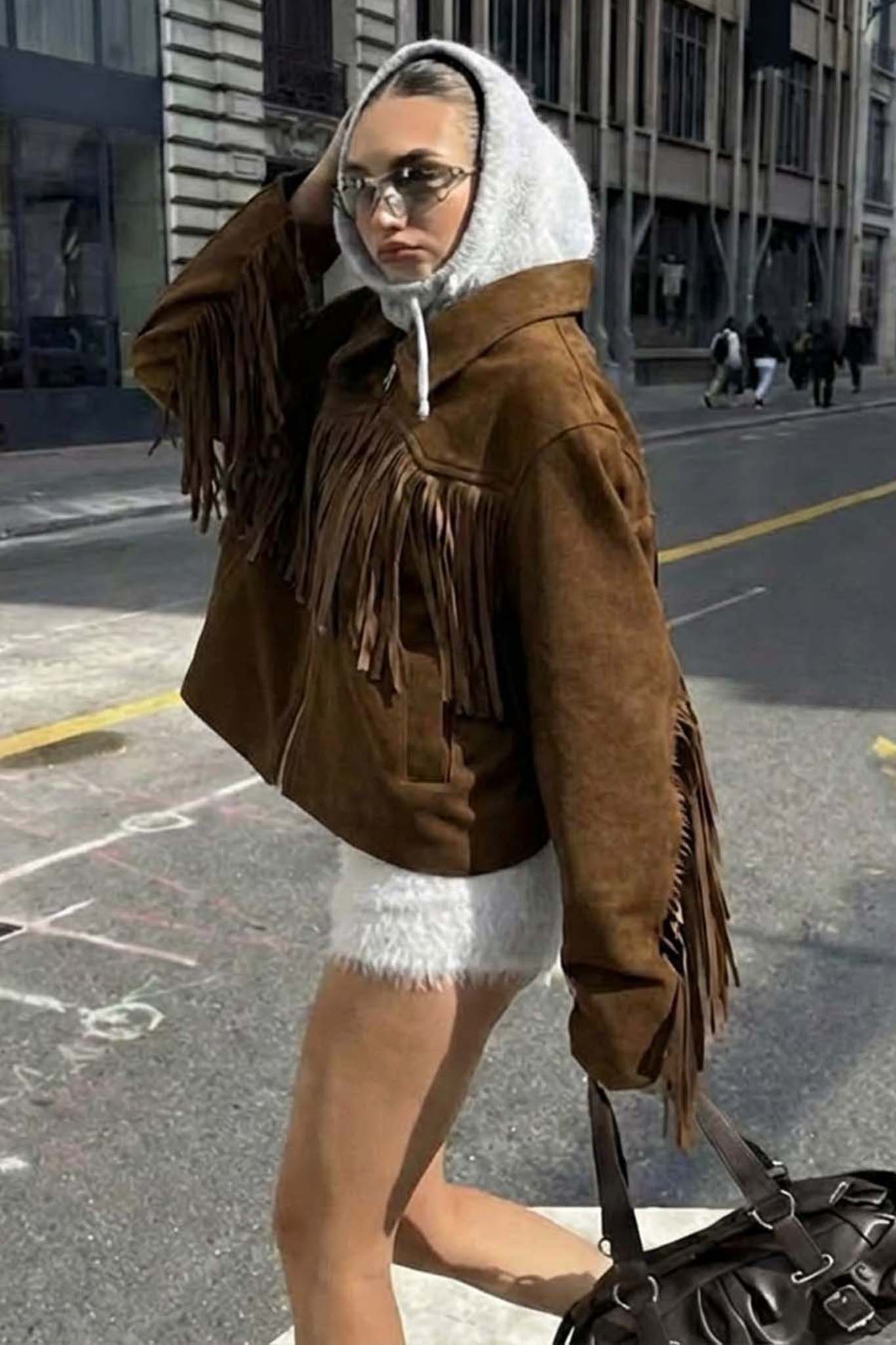 Σουέτ Τζάκετ με Κρόσια. Κατασκευασμένο από μαλακό σουέτ, ξεχωρίζει για τα πλούσια κρόσια που διατρέχουν το στήθος και τα μανίκια, προσδίδοντας κίνηση και αυθεντικό bohemian αέρα. Διαθέτει φερμουάρ και κλασικό γιακά.