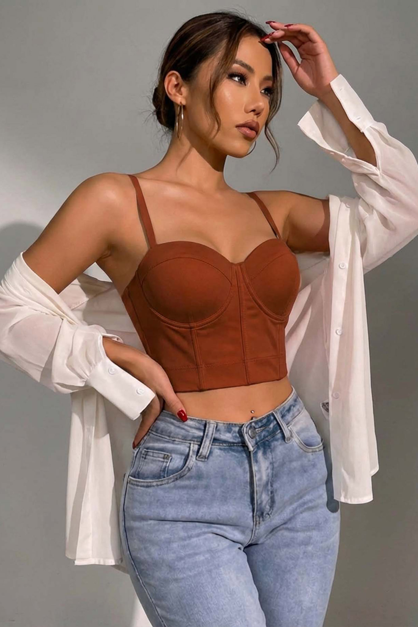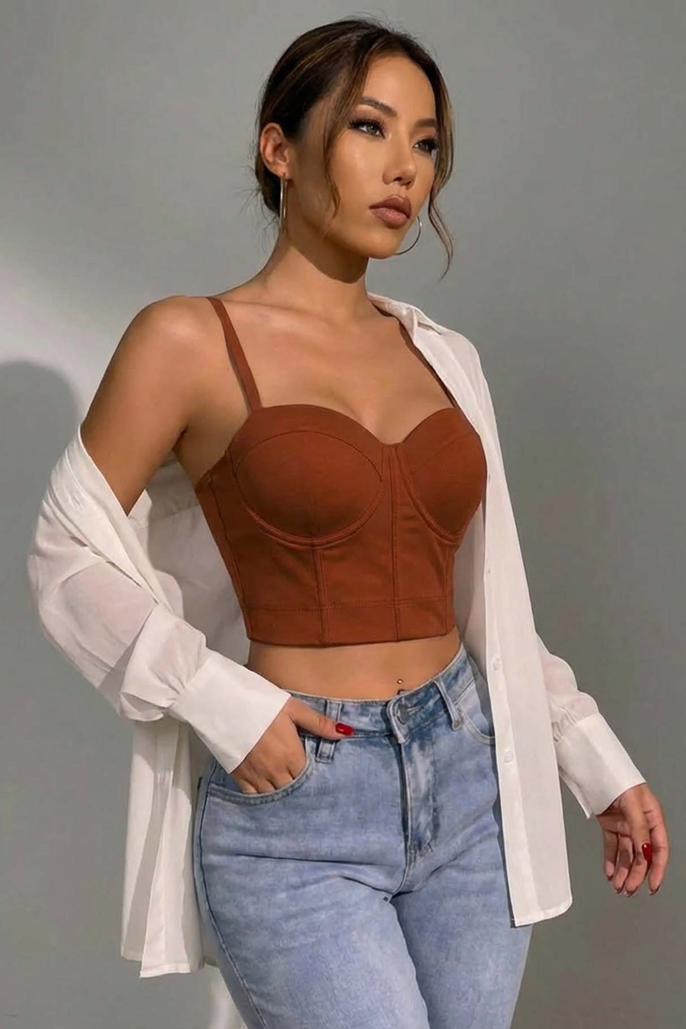 Crop τοπ κορσές. Διαθέτει ενισχυμένα cups και ρυθμιζόμενες τιράντες που εξασφαλίζουν σταθερότητα και άνεση, ενώ το στενό, crop τελείωμά του σμιλεύει τη σιλουέτα με τον πιο κομψό τρόπο.