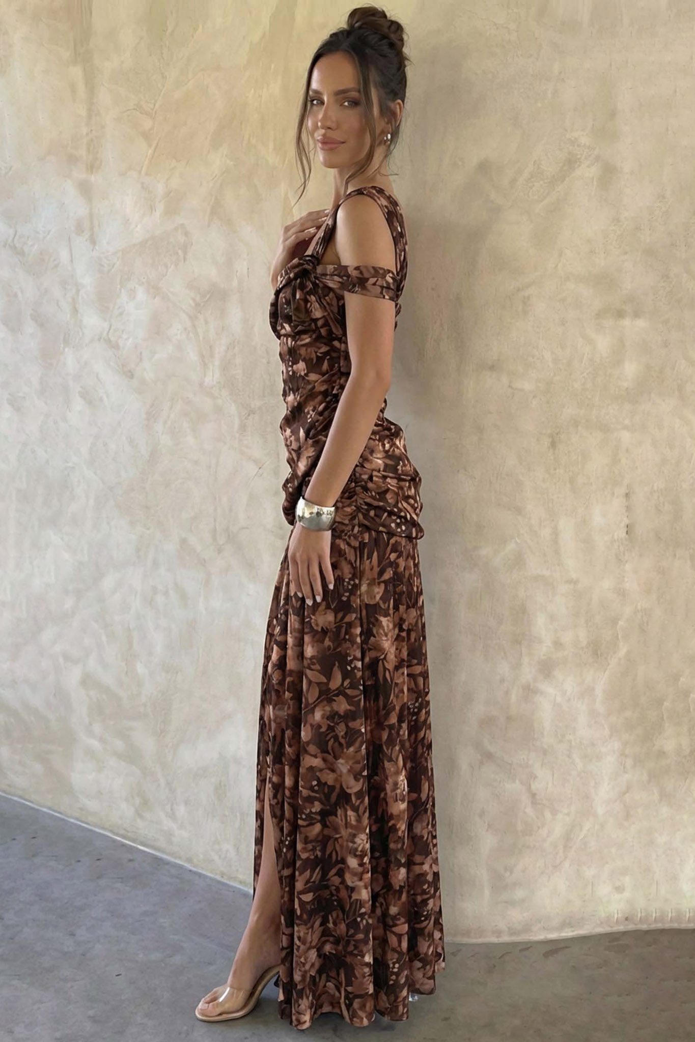 Μάξι φόρεμα σε στενή γραμμή, το οποίο διακρίνεται για τον ιδιαίτερο one-shoulder σχεδιασμό του με διπλή τιράντα στον έναν ώμο. Το επάνω μέρος διαθέτει λεπτομέρειες με σούρες που αγκαλιάζουν το σώμα, ενώ η μακριά φούστα ολοκληρώνεται με ένα εντυπωσιακό υψηλό σκίσιμο στο πλάι. Το ύφασμα είναι διακοσμημένο με ένα φίνο floral μοτίβο σε όλη του την επιφάνεια, προσδίδοντας μια αέρινη και ρομαντική αίσθηση στο σύνολο. Μήκος 135cm, στήθος 80cm.