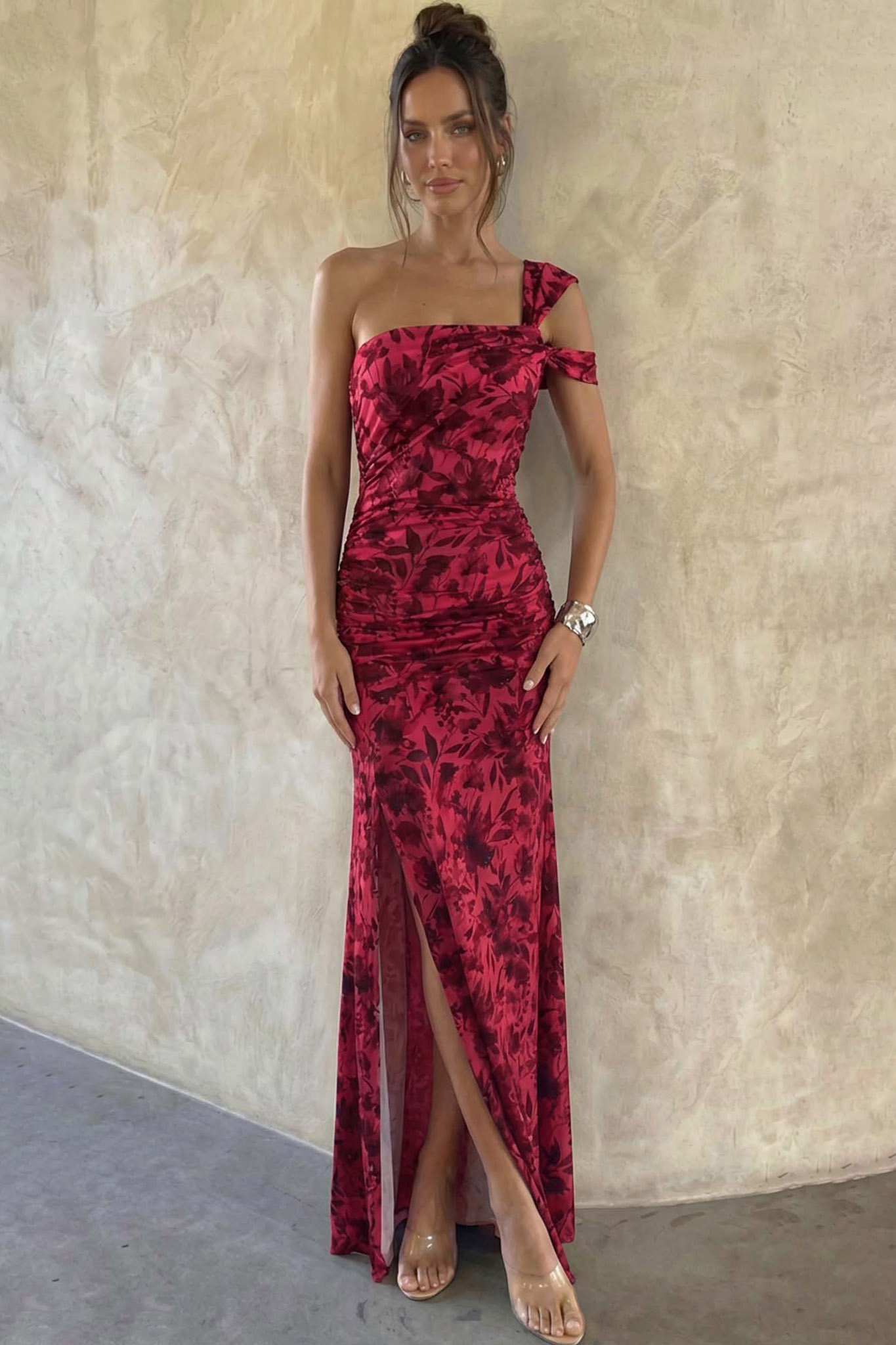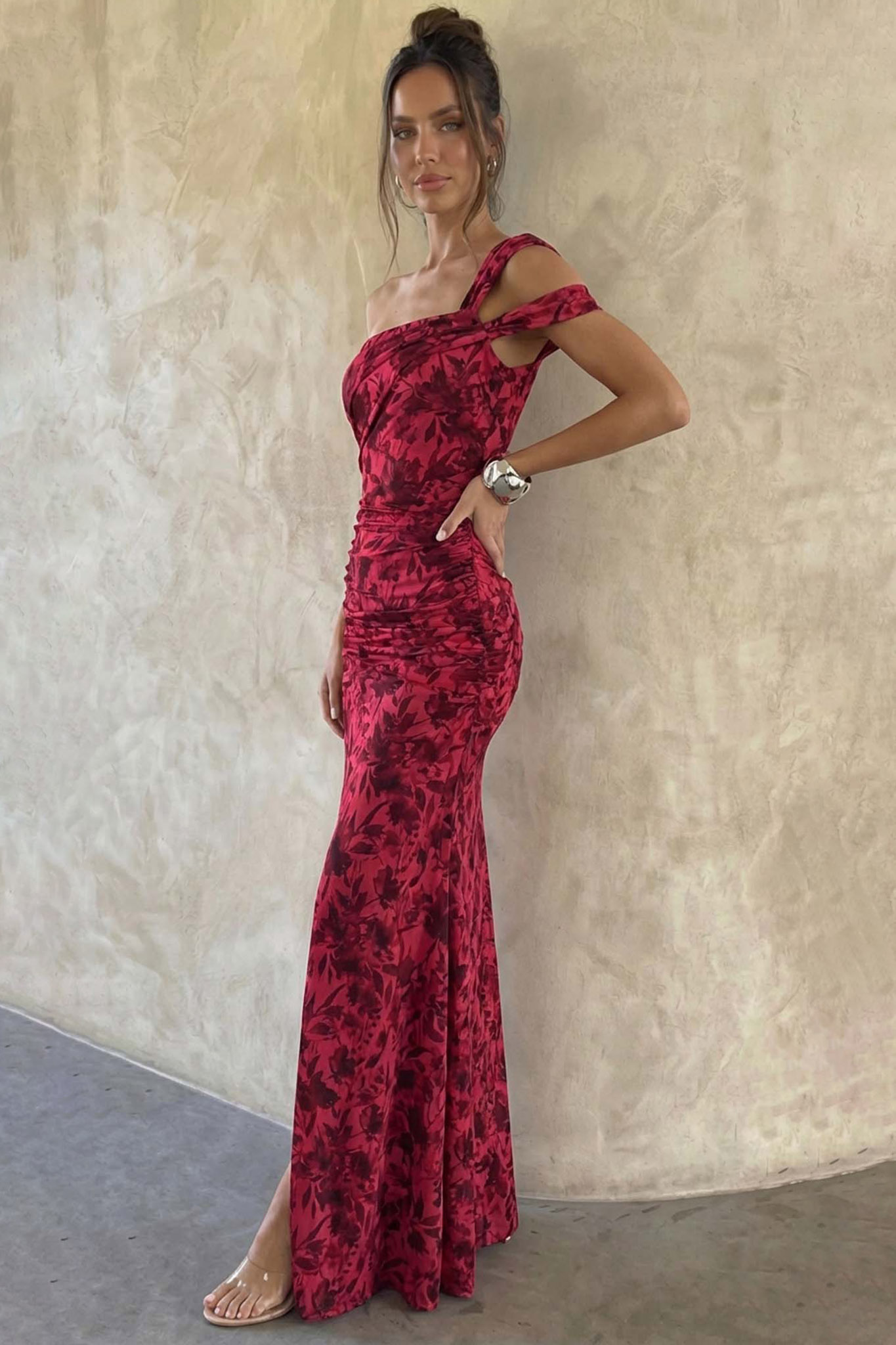 Μάξι φόρεμα σε στενή γραμμή, το οποίο διακρίνεται για τον ιδιαίτερο one-shoulder σχεδιασμό του με διπλή τιράντα στον έναν ώμο. Το επάνω μέρος διαθέτει λεπτομέρειες με σούρες που αγκαλιάζουν το σώμα, ενώ η μακριά φούστα ολοκληρώνεται με ένα εντυπωσιακό υψηλό σκίσιμο στο πλάι. Το ύφασμα είναι διακοσμημένο με ένα φίνο floral μοτίβο σε όλη του την επιφάνεια, προσδίδοντας μια αέρινη και ρομαντική αίσθηση στο σύνολο. Μήκος 135cm, στήθος 80cm.