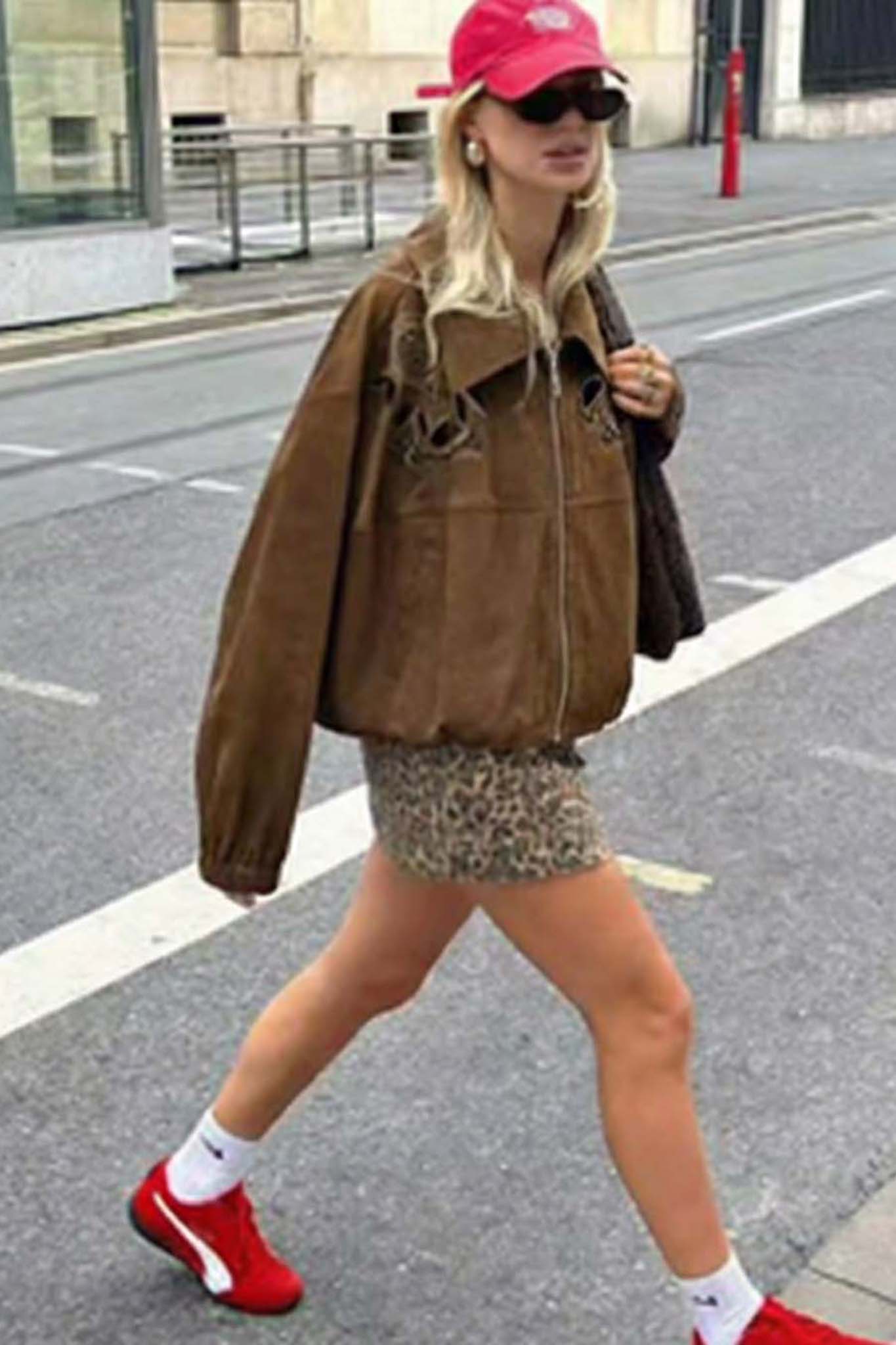 Κοντό σουέτ τζάκετ προσφέρει μια πολυτελή αίσθηση και άνεση. Το σχέδιο ξεχωρίζει χάρη στα περίτεχνα διακοσμητικά κοψίματα σε στυλ western ή έθνικ στο στήθος και τους ώμους, που προσθέτουν μια μοναδική πινελιά. Διαθέτει κλασικό γιακά, πρακτικό κλείσιμο με φερμουάρ και ελαστικά τελειώματα στα μανίκια και το κάτω μέρος (bomber style), συνδυάζοντας την αισθητική του vintage με τη σύγχρονη μόδα.