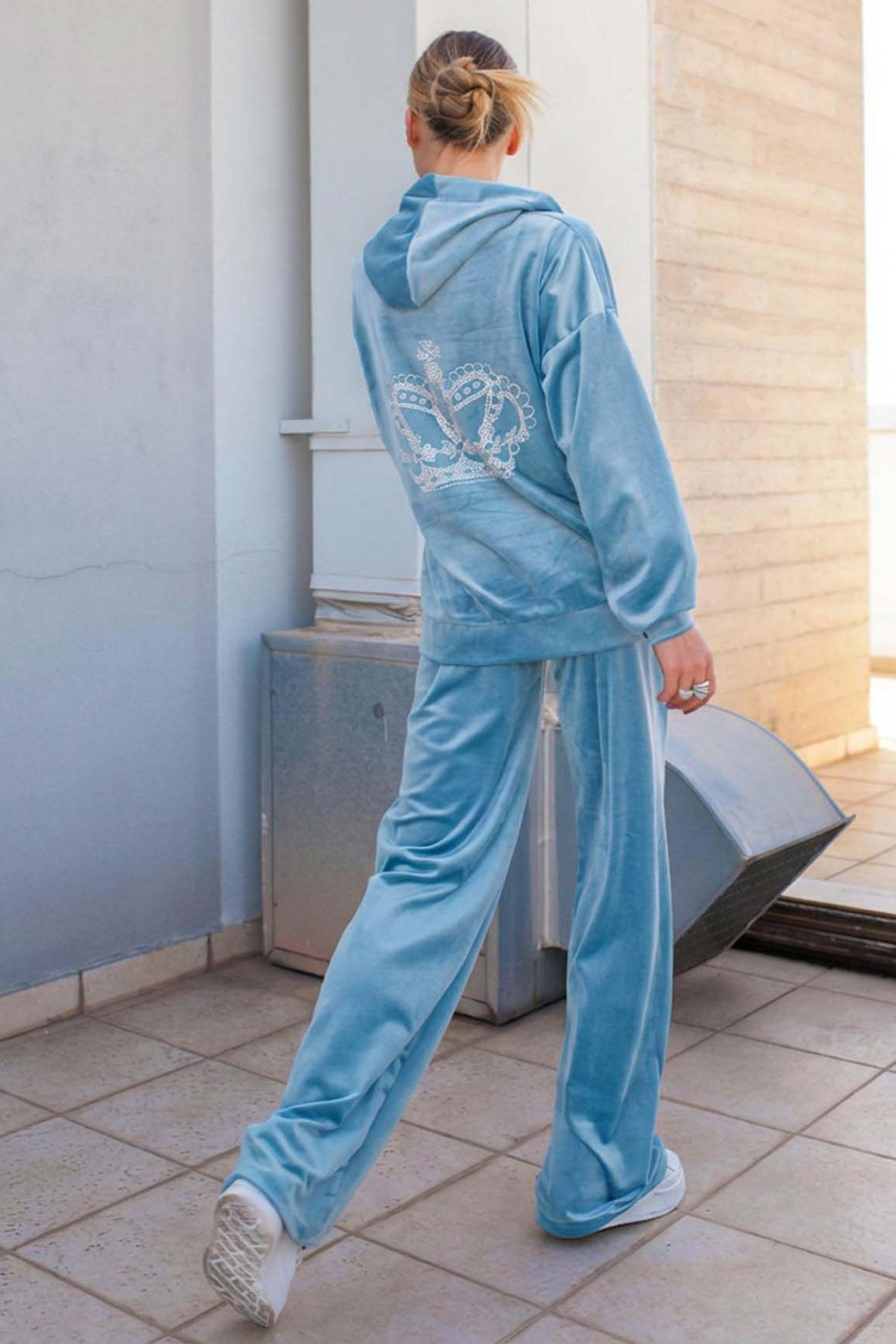 Σετ με βελούδινη υφή. Αποτελείται από ζακέτα με κουκούλα και strass & παντελόνι σε ίσια γραμμή και λάστιχο με κορδόνι στη μέση. Είναι εφαρμοστό. Προσφέρει ένα sporty και θηλυκό αποτέλεσμα. Ιδανικό για καθημερινές εμφανίσεις. Μετρήσεις: Μπλούζα:Στήθος 120cm μήκος 60cm μανίκι 60cm. Παντελόνι: μέση 76cm μήκος 110cm.