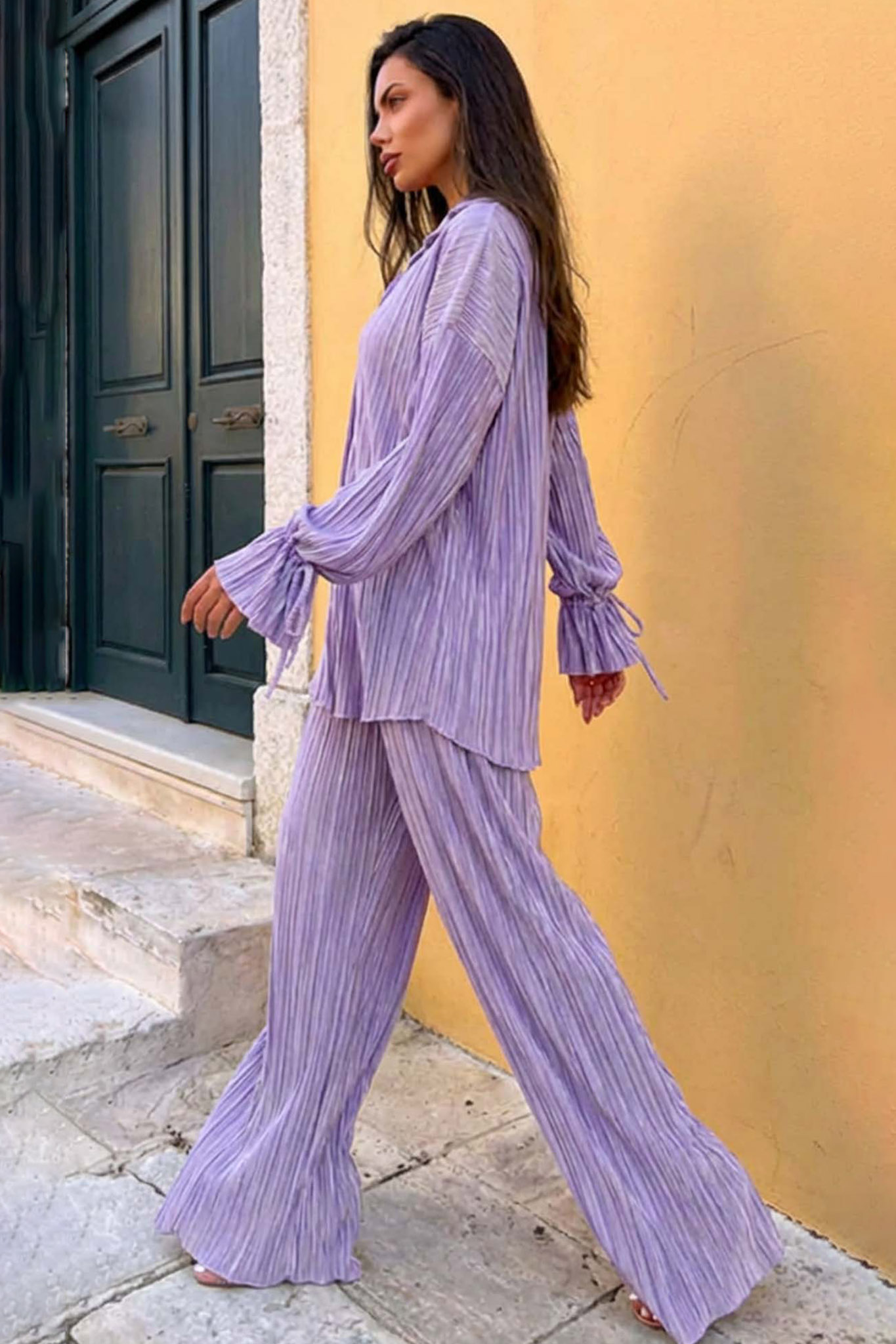 Πλισέ σετ δύο τεμαχίων προσφέρει μια αέρινη και εκλεπτυσμένη εμφάνιση, συνδυάζοντας ένα άνετο πουκάμισο με εντυπωσιακά δεσίματα στα μανίκια και μια φαρδιά παντελόνα. Η ανάλαφρη υφή του υφάσματος χαρίζει κομψή κίνηση και άνεση, δημιουργώντας μια σιλουέτα που αναδεικνύει κάθε εμφάνιση από το πρωί έως το βράδυ.