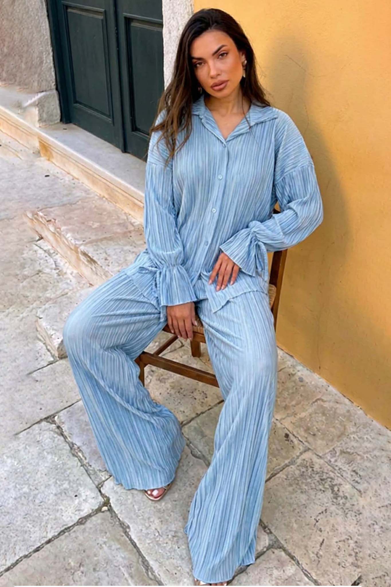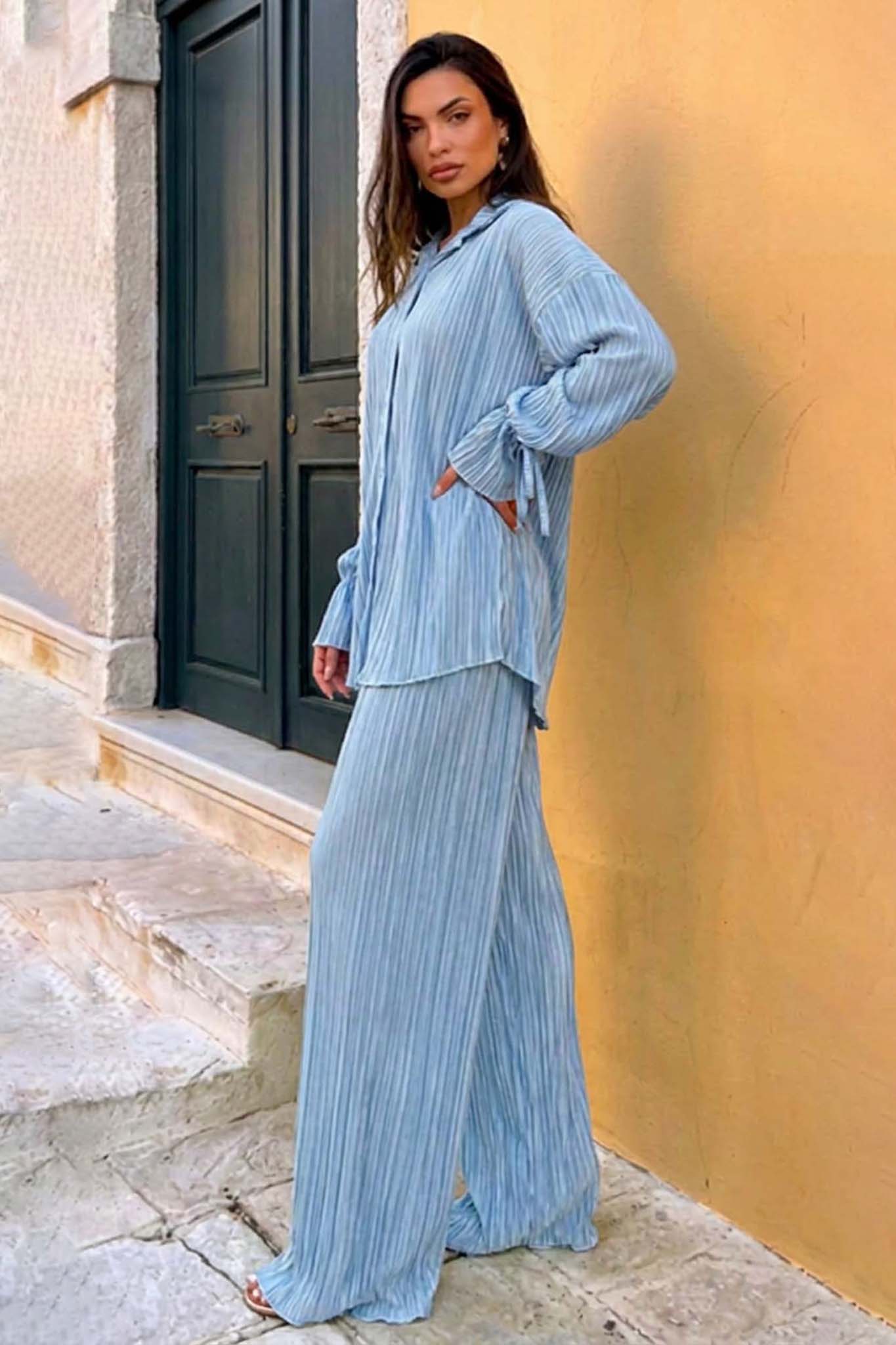 Πλισέ σετ δύο τεμαχίων προσφέρει μια αέρινη και εκλεπτυσμένη εμφάνιση, συνδυάζοντας ένα άνετο πουκάμισο με εντυπωσιακά δεσίματα στα μανίκια και μια φαρδιά παντελόνα. Η ανάλαφρη υφή του υφάσματος χαρίζει κομψή κίνηση και άνεση, δημιουργώντας μια σιλουέτα που αναδεικνύει κάθε εμφάνιση από το πρωί έως το βράδυ.