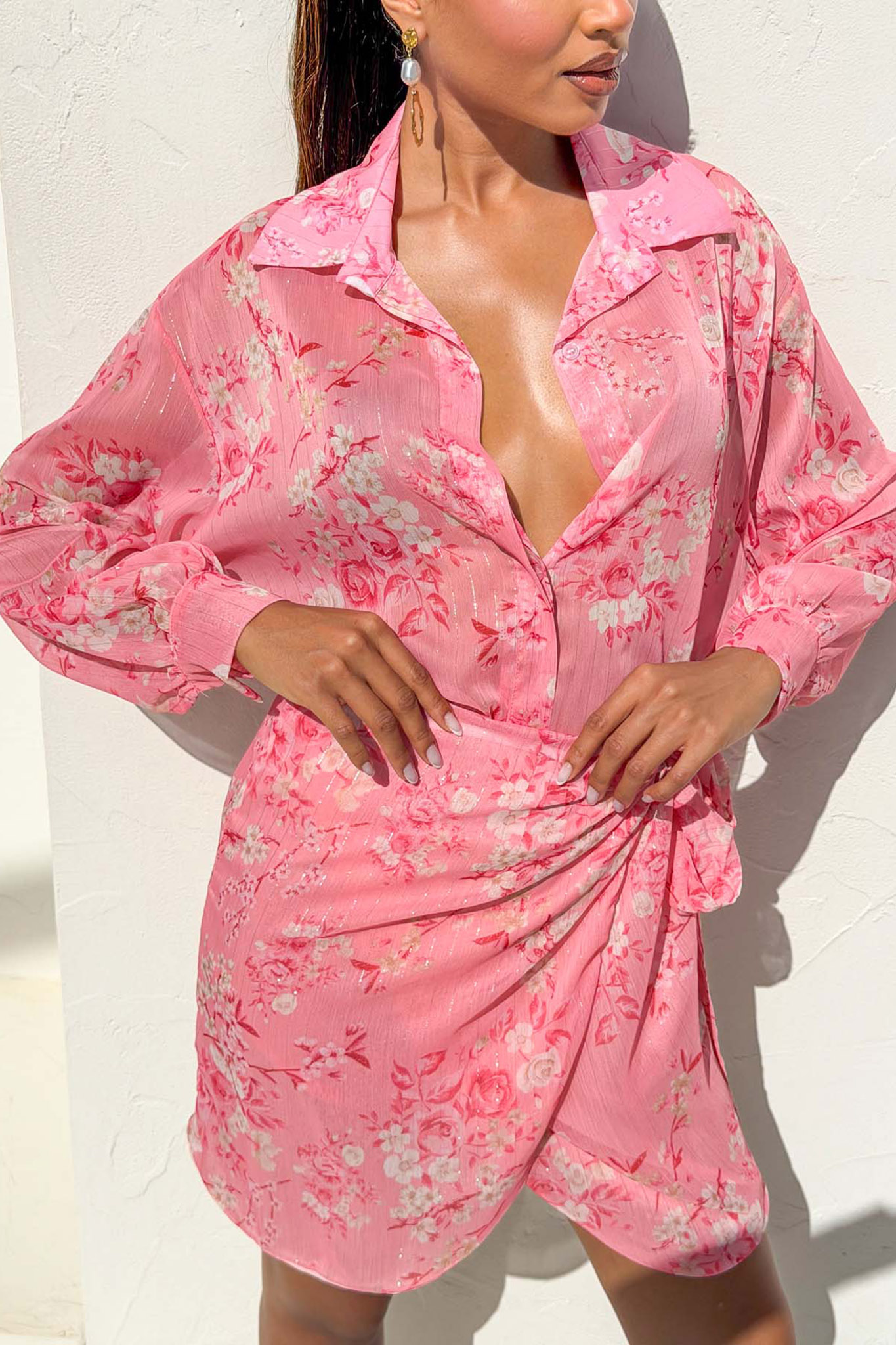 Φλοράλ σετ το οποίο αποτελεί την ιδανική επιλογή για εντυπωσιακές και δροσερές καλοκαιρινές εμφανίσεις. Αποτελείται από ένα μακρυμάνικο πουκάμισο με κλασικό γιακά και μια μίνι κρουαζέ φούστα που δένει κομψά στο πλάι, προσφέροντας μια θηλυκή και άνετη εφαρμογή.