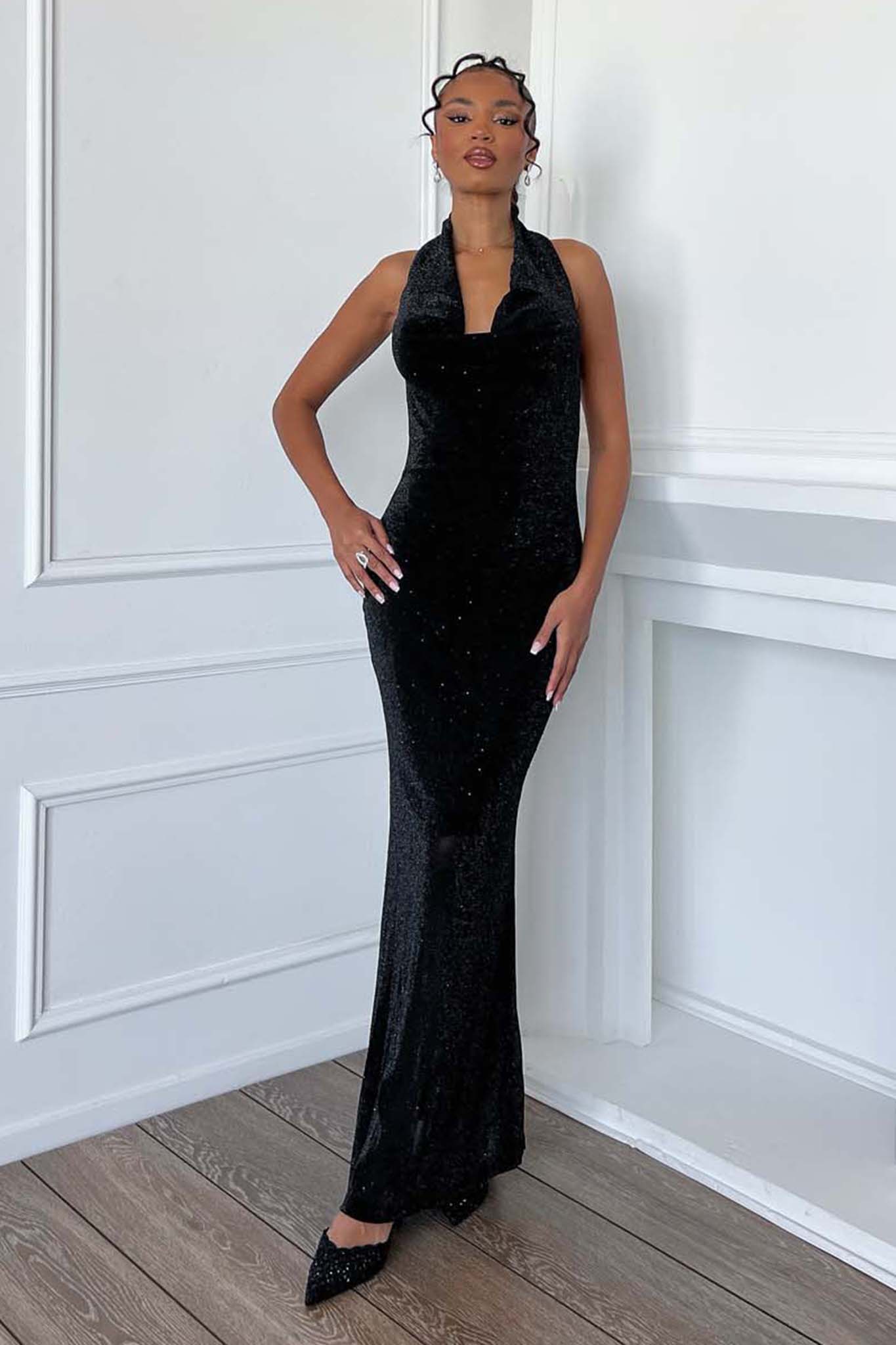 Φόρεμα μάξι με λάμψη, δέσιμο στον λαιμό και σούρα στο στήθος, εφαρμόζει στο σώμα και κολακεύει ιδιαίτερα. Ιδανικό για party και βραδινές εξόδους. Μήκος 155cm, στήθος 40cm.