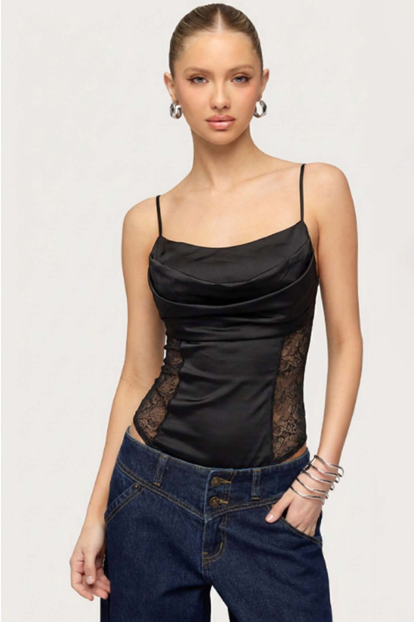 Κορμάκι νραπέ με λεπτές, ρυθμιζόμενες τιράντες που τονίζουν τους ώμους. Τα πλαϊνά τμήματα είναι διακοσμημένα με διάφανη δαντέλα, δημιουργώντας ένα εφέ κορσέ που αγκαλιάζει και σμιλεύει τη σιλουέτα. Είναι μια ιδανική επιλογή για βραδινές εμφανίσεις, καθώς μπορεί να φορεθεί τόσο με τζιν για ένα πιο “cool” look όσο και με επίσημο παντελόνι. Μήκος 70cm, στήθος 80cm.