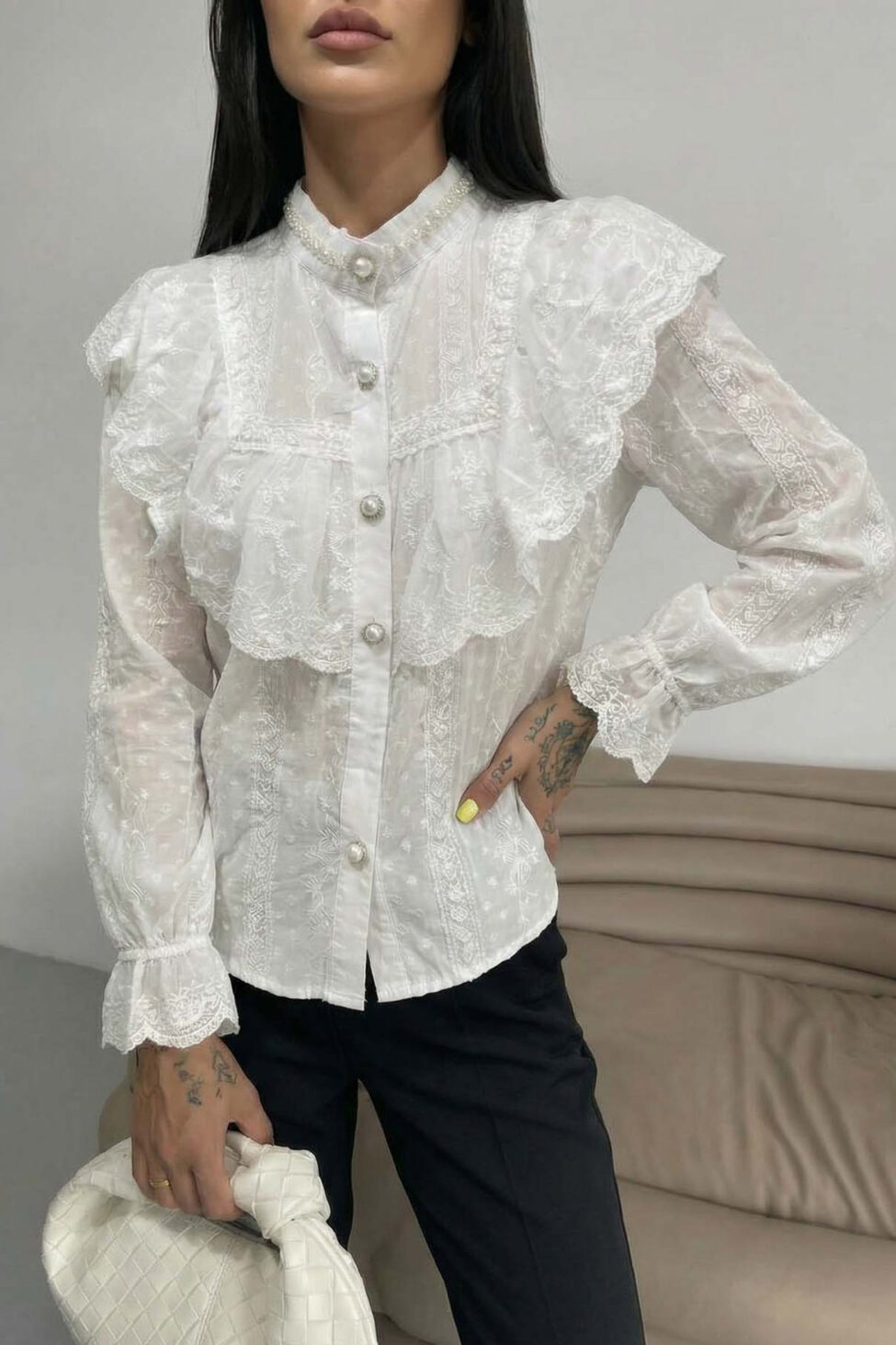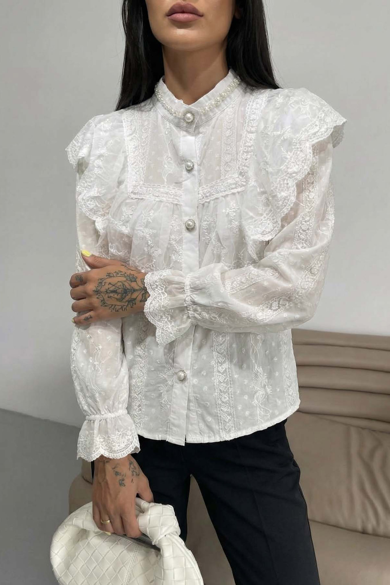 Ρομαντικό δαντελένιο πουκάμισο σε εκρού χρώμα με έντονες vintage επιρροές. Χαρακτηρίζεται από τα βολάν στο στήθος, τον όρθιο γιακά με πέρλες και τις μανσέτες με δαντέλα, προσφέροντας ένα κομψό και θηλυκό στυλ που θυμίζει βικτοριανή εποχή.