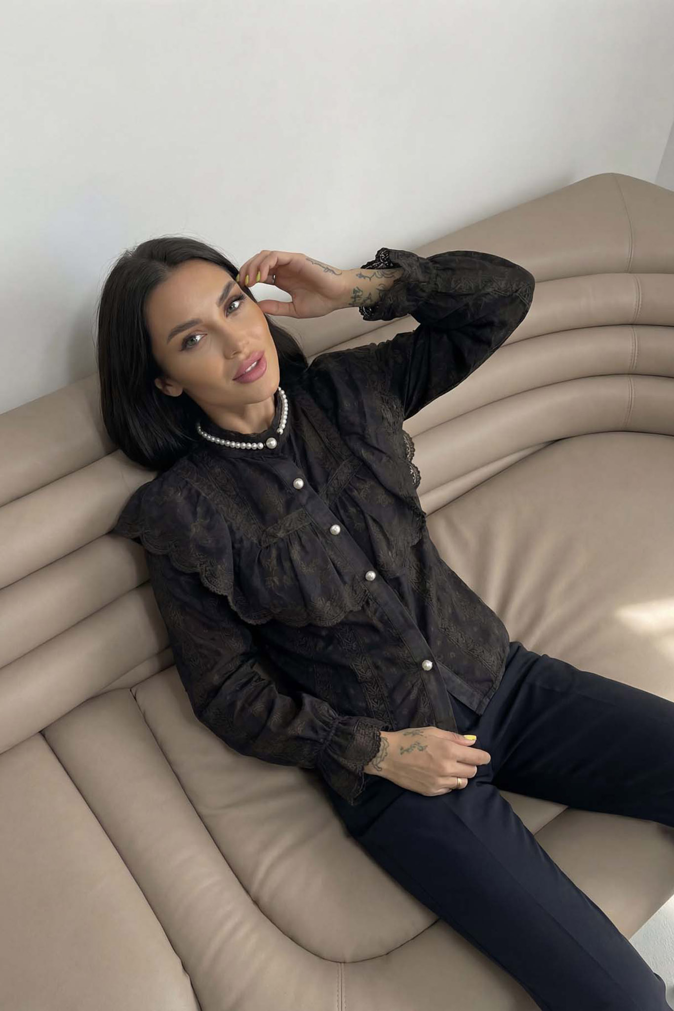 Badenπουκάμισο με βολάν και πέρλες στον γιακά μαύρο