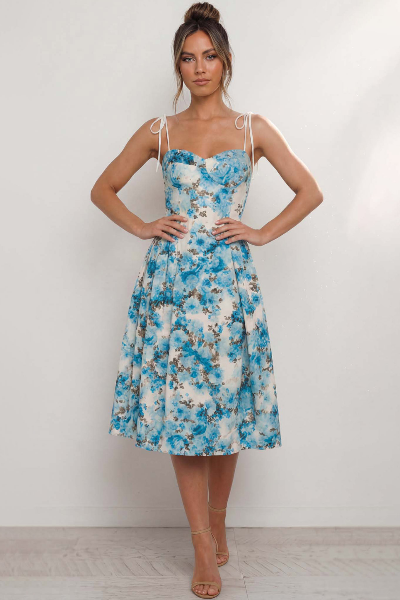 Φλοράλ Μίντι Φόρεμα με λεπτές τιράντες. Εφαρμοστό μπούστο με ντεκολτέ σε σχήμα καρδιάς που κολακεύει το στήθος. Μήκος 106cm, στήθος 84cm