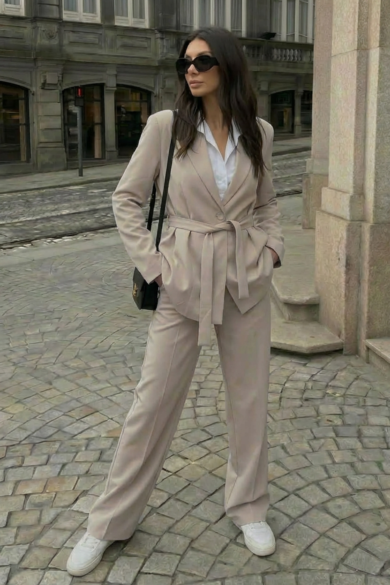 Σετ σακάκι παντελόνι με ενσωματωμένη ζώνη. Αναδεικνύει την σιλουέτα. Προσφέρει κομψό και άνετο αποτέλεσμα. Ιδανικό για καθημερινές προσεγμένες εμφανίσεις, το γραφείο ή τη βόλτα.