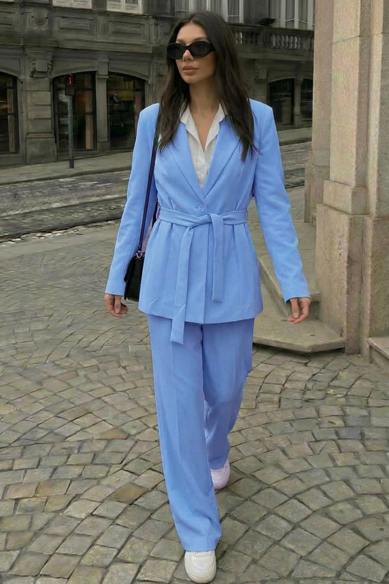 Σετ σακάκι παντελόνι με ενσωματωμένη ζώνη. Αναδεικνύει την σιλουέτα. Προσφέρει κομψό και άνετο αποτέλεσμα. Ιδανικό για καθημερινές προσεγμένες εμφανίσεις, το γραφείο ή τη βόλτα.