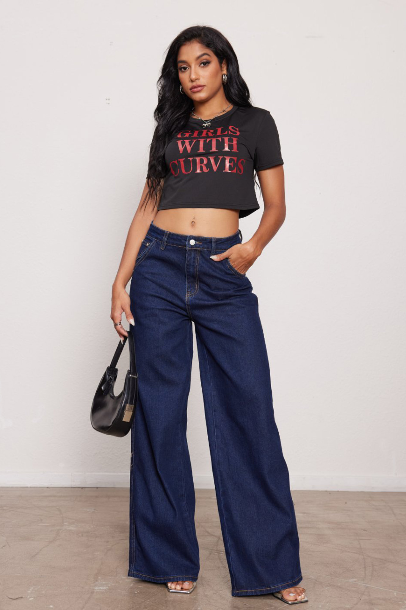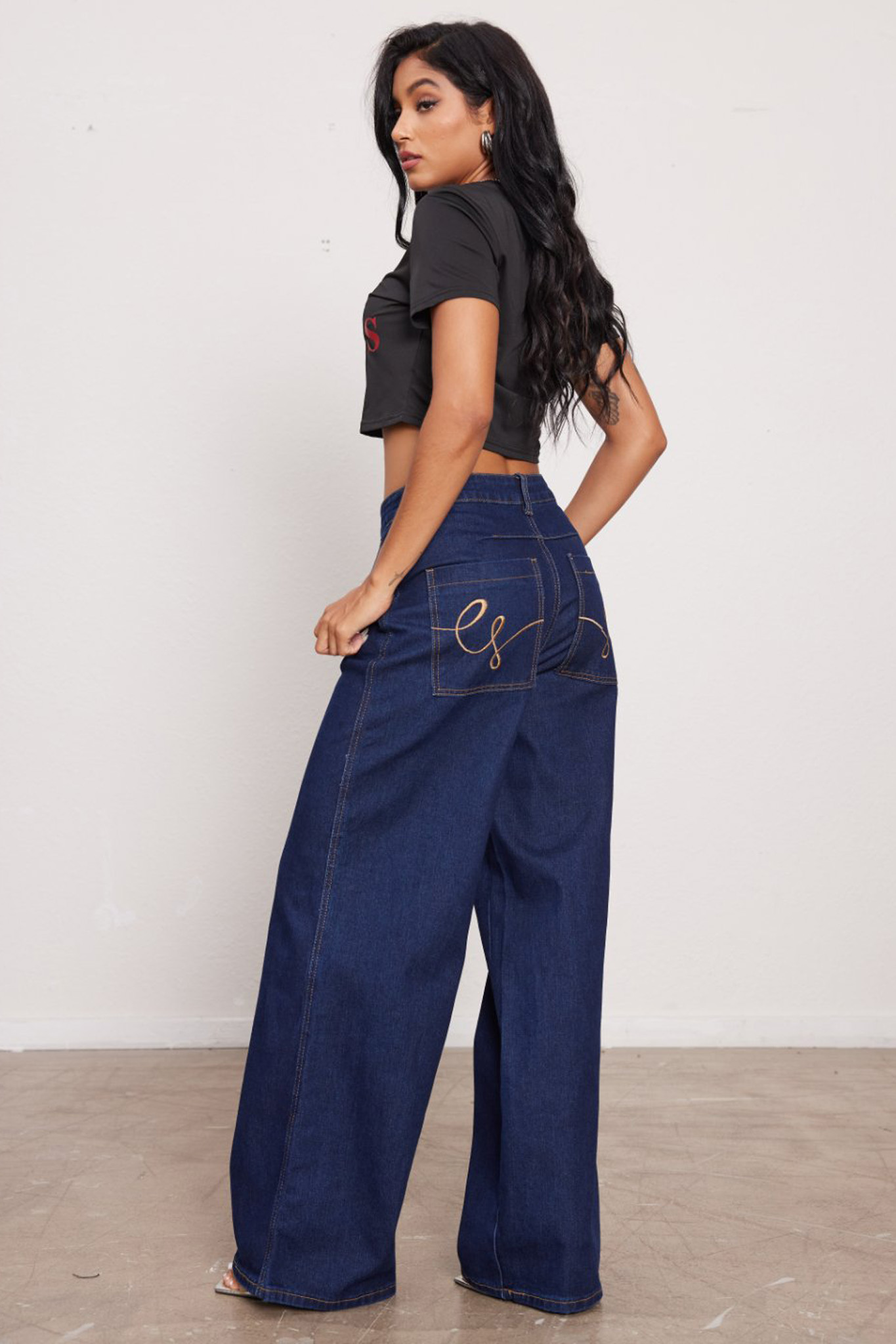Wide leg τζιν παντελόνι σε σκούρο χρωματισμό και ανοιχτή γραμμή, έχει άνετη εφαρμογή.