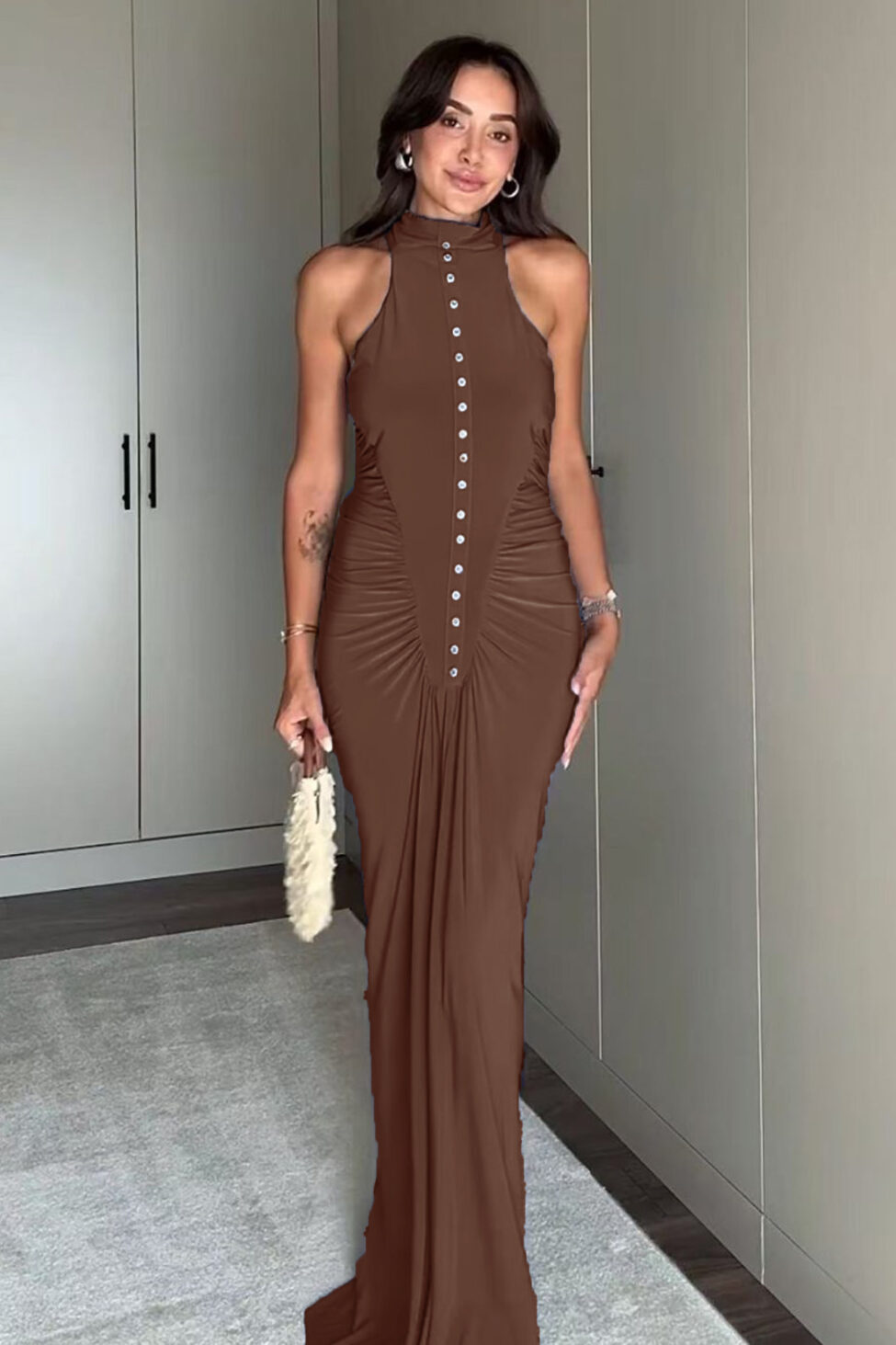 Φόρεμα μάξι, ψηλή λαιμόκοψη και κουμπιά κατά μήκος στο μπροστινό μέρος. Διαθέτει σούρες που αγκαλιάζουν τη σιλουέτα, προσφέροντας θηλυκό και εντυπωσιακό αποτέλεσμα. Ιδανικό για βραδινές εξόδους, γάμους ή επίσημες περιστάσεις.