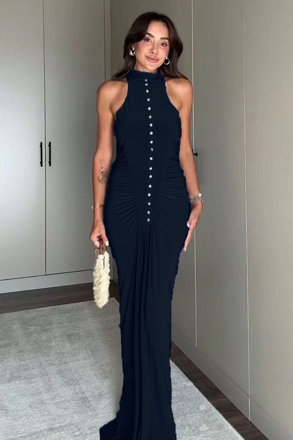 Φόρεμα μάξι, ψηλή λαιμόκοψη και κουμπιά κατά μήκος στο μπροστινό μέρος. Διαθέτει σούρες που αγκαλιάζουν τη σιλουέτα, προσφέροντας θηλυκό και εντυπωσιακό αποτέλεσμα. Ιδανικό για βραδινές εξόδους, γάμους ή επίσημες περιστάσεις.