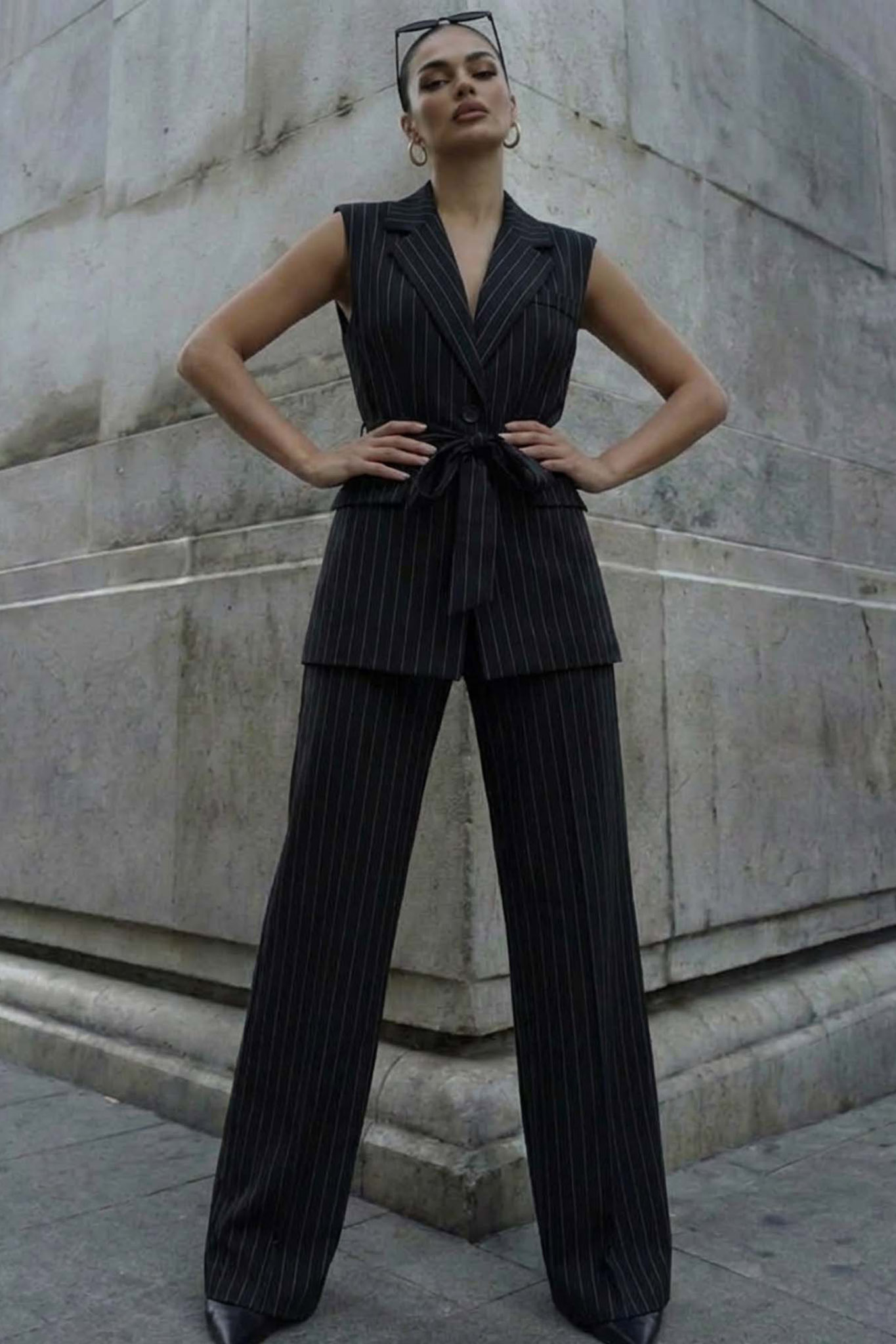 Σετ Ριγέ Μακρύ Γιλέκο με Ζώνη & Παντελόνα. Ένα διαχρονικό κομμάτι που συνδυάζει την αυστηρότητα ενός κοστουμιού με τη θηλυκότητα, ιδανικό για office looks, κοινωνικές εκδηλώσεις ή chic απογευματινές βόλτες.