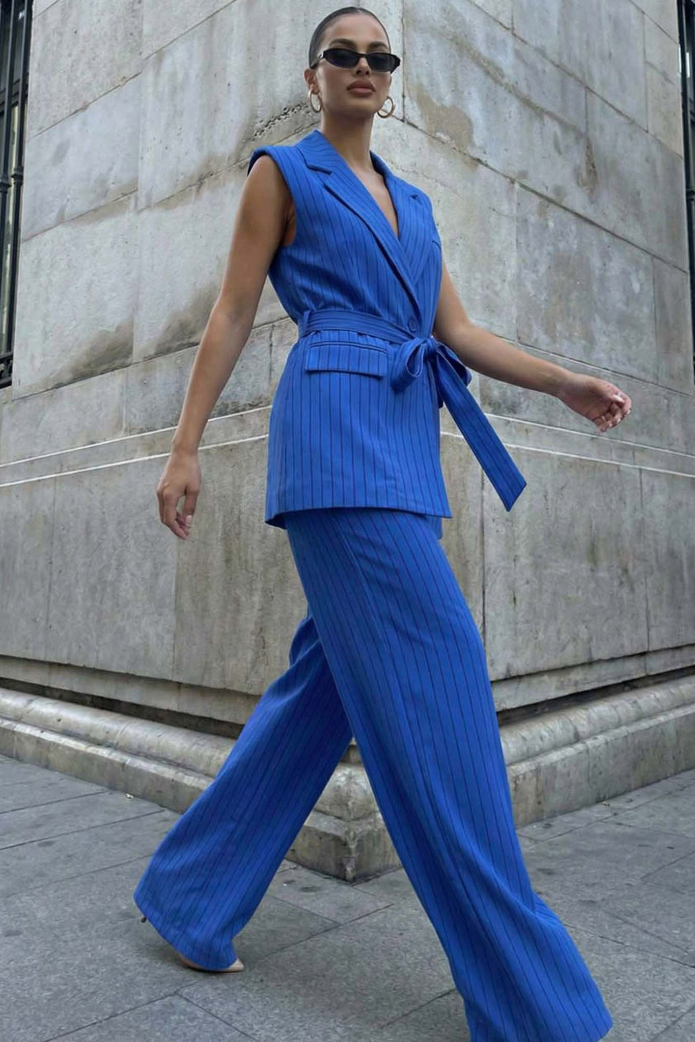 Σετ Ριγέ Μακρύ Γιλέκο με Ζώνη & Παντελόνα. Ένα διαχρονικό κομμάτι που συνδυάζει την αυστηρότητα ενός κοστουμιού με τη θηλυκότητα, ιδανικό για office looks, κοινωνικές εκδηλώσεις ή chic απογευματινές βόλτες.