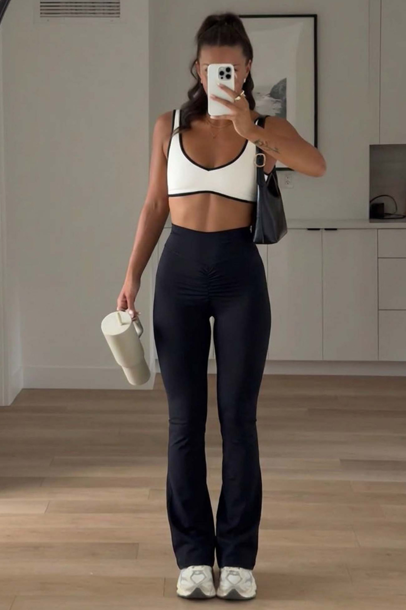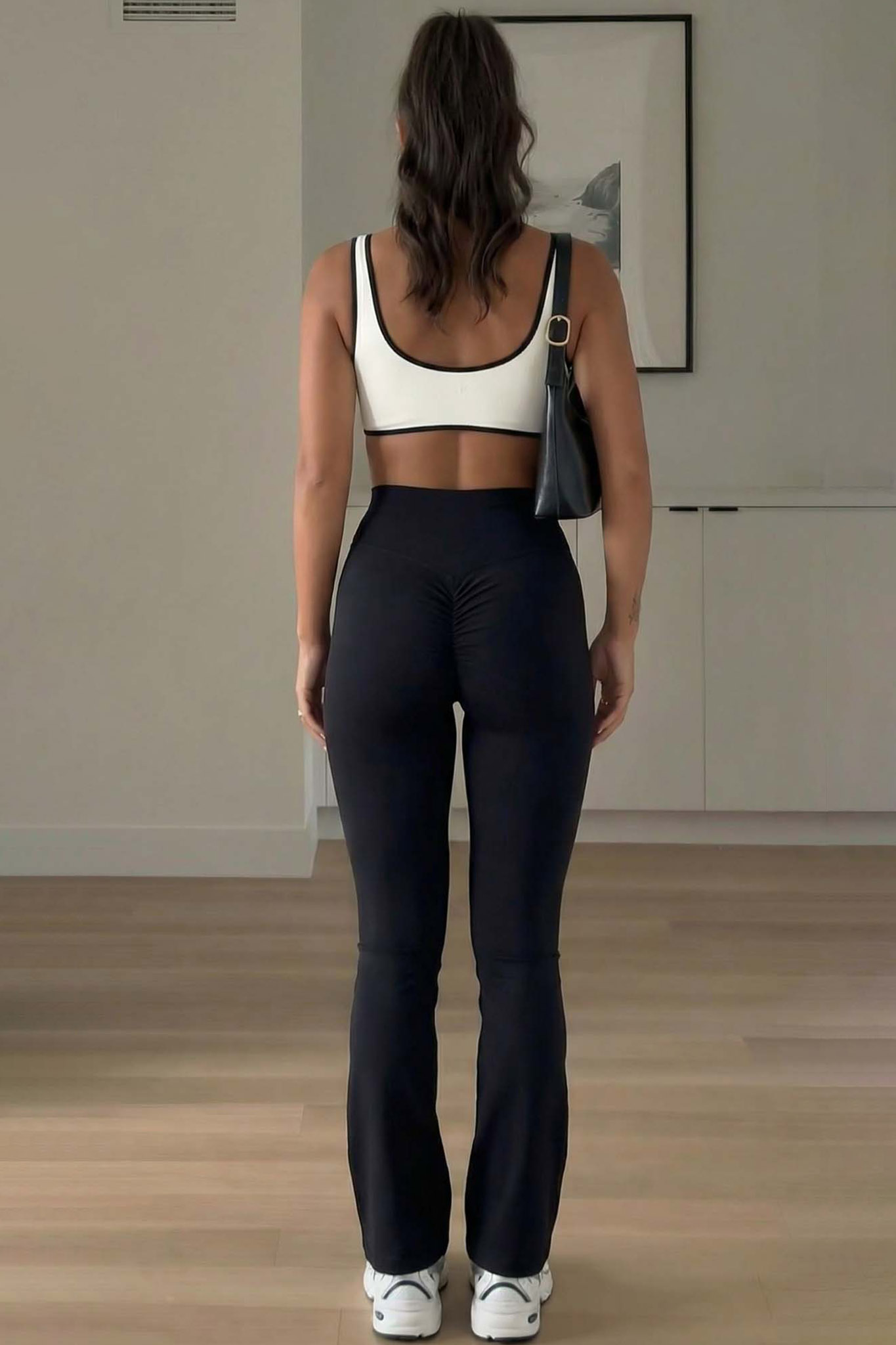 Ψηλόμεσο κολάν καμπάνα διαθέτει μια ιδιαίτερη λεπτομέρεια με σούρα στο πίσω μέρος, η οποία είναι σχεδιασμένη για να αναδεικνύει τις καμπύλες και να προσφέρει εφέ push-up.